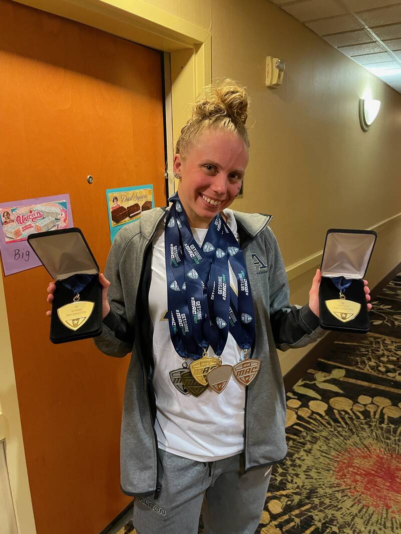 Rachel Sabotin collected plenty of hardware in helping lead Akron to the Mid-American Conference women’s swimming title last weekend at Ohio University.