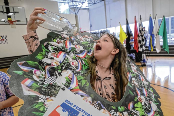 Mike Wolanin | The Republic CSA Fodrea fourth grader Jody Shuler pretends to drink a bottle of milk while wearing a prop winner’s wreath during the 500 Festival Education Program’s Mobile Study Trip at CSA Fodrea in Columbus, Ind., Monday, Mar. 4, 2024. Fourth grade students at the school visited various stations to learn the ins and outs of the Indianapolis 500.