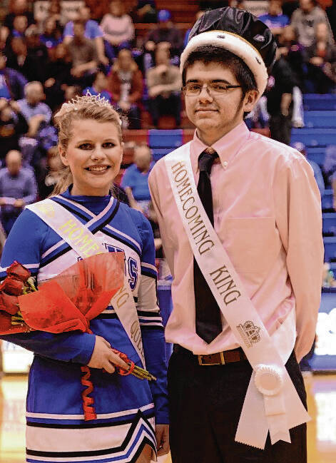 Homecoming Queen Taylor AmRhein and King Kyle Reeves pose after being crowned during halftime at the Jennings County High School’s home boys basketball game against Franklin Community High School on Feb. 28, 2014.