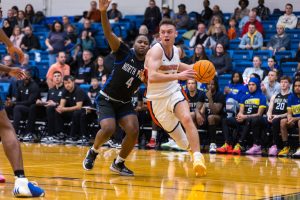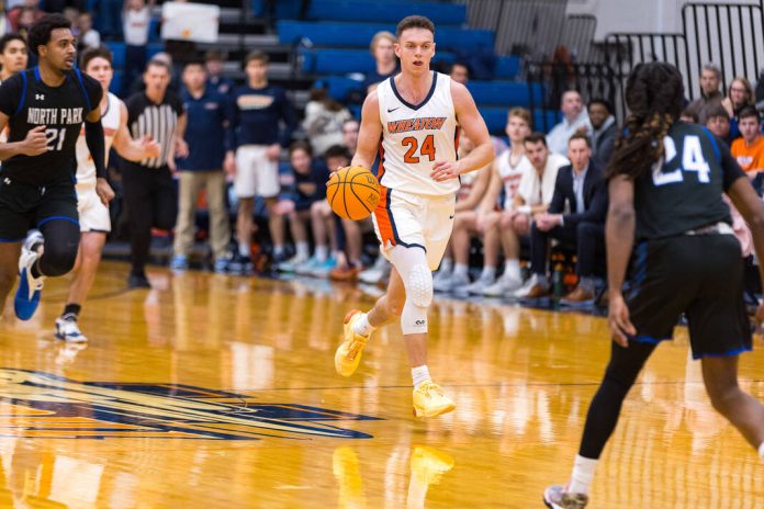 Wheaton men’s basketball player and Columbus North grad Nick Schiavello, right, dribbles the ball up the court in a game against North Park at King Arena in Wheaton, Ill. on Feb. 17, 2024.