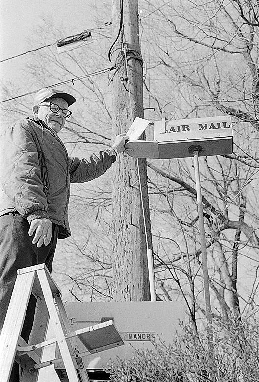 Postage rates have Norton Kennedy, 62, stretching to new heights as he mails a letter on March 18, 1974. The mailbox had been a fixture at the Kennedy home for some time, acting as a gag to amuse passing motorists.