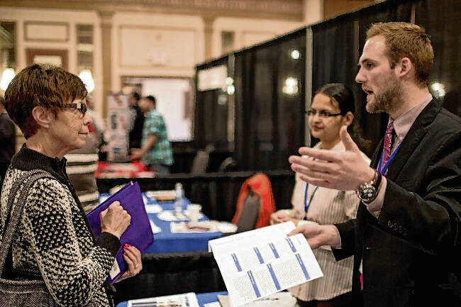 Peggy Carmichael speaks with Joshua Ogle and Sanyita Pallod of SIHO Insurance Services during the annual Republic Job Fair on March 19, 2014, at the Clarion Hotel and Conference Center.