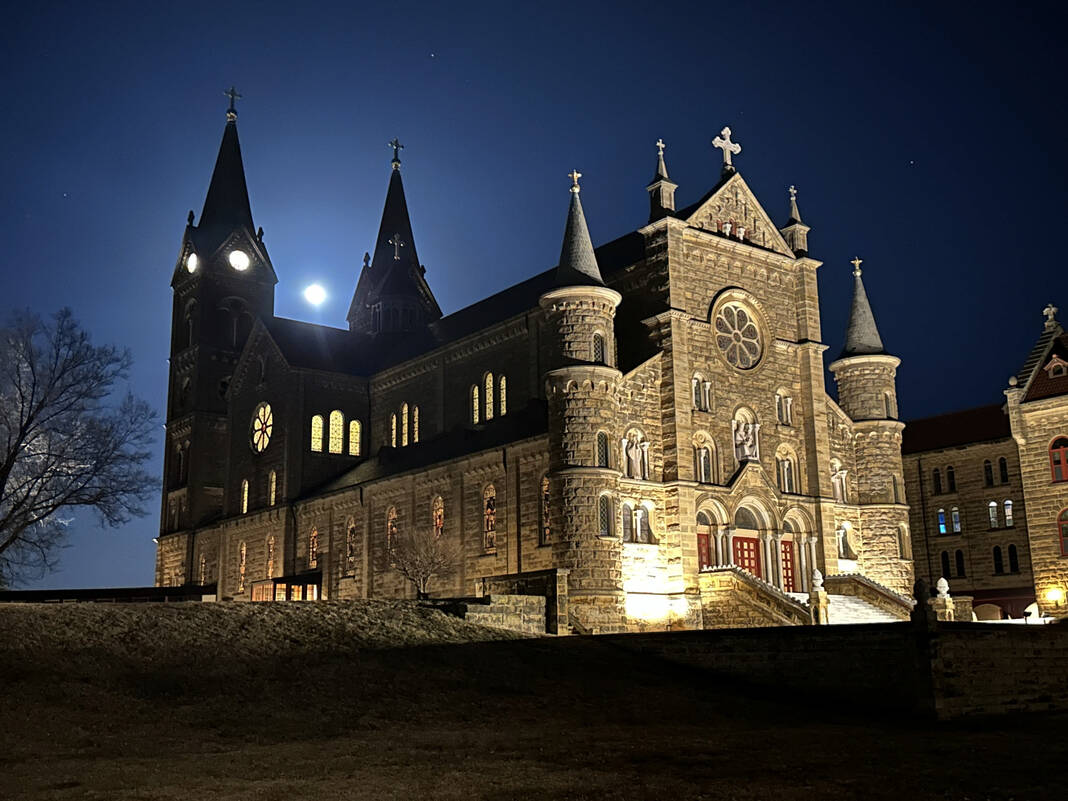 Greg Scherschel captured this amazing shot of February’s full Wolf moon rising between the twin spires of St. Meinrad Archabbey Church during a recent retreat at the Catholic seminary in southwest Indiana.