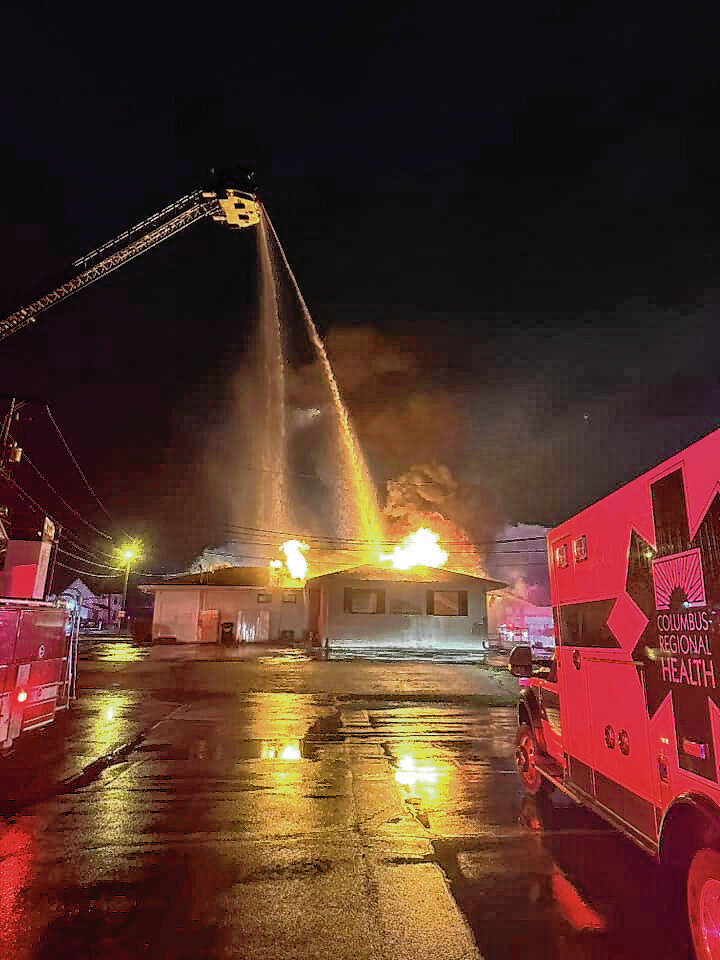 With heavy fire gaining ground in the attic space of the building, firefighters set up two master streams from the Columbus Fire and Columbus Township Fire Department aerial trucks. The elevated water streams operated for approximately one hour before the fire was marked under control.