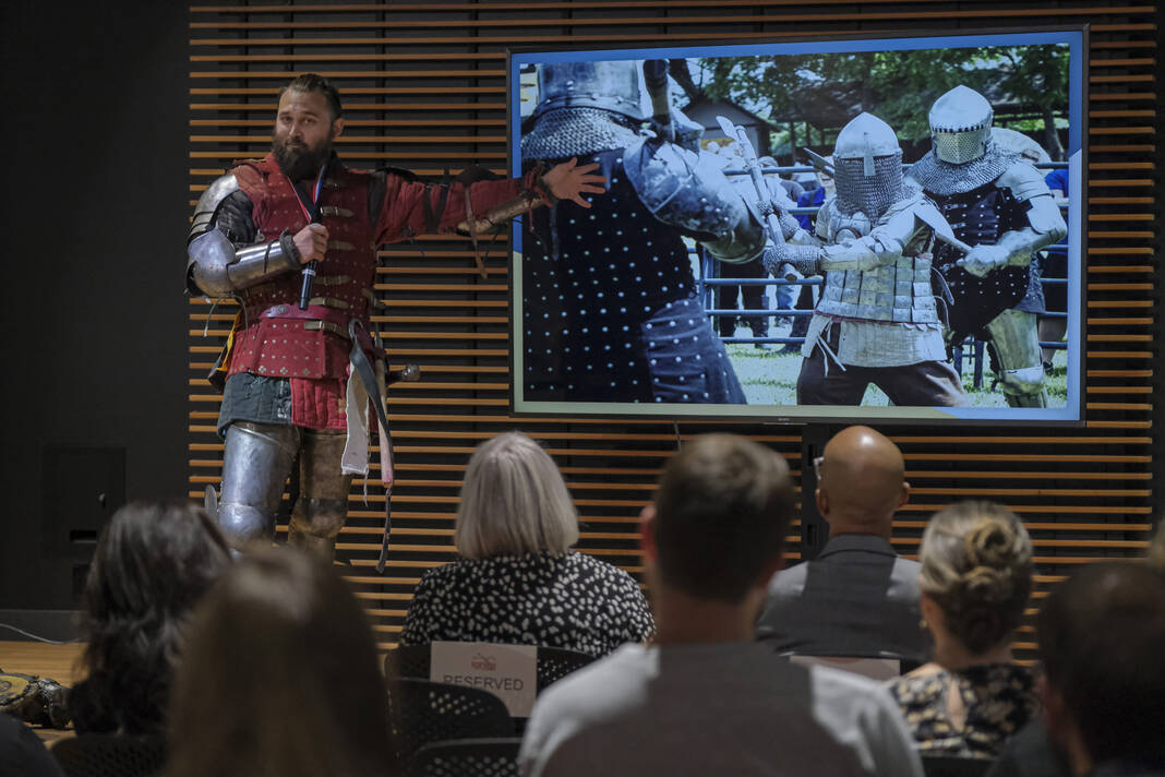 Dakota Miller gives a presentation about creating a medieval combat at a past event. He and his group will be a part of Eclipsing the Renaissance April 8.