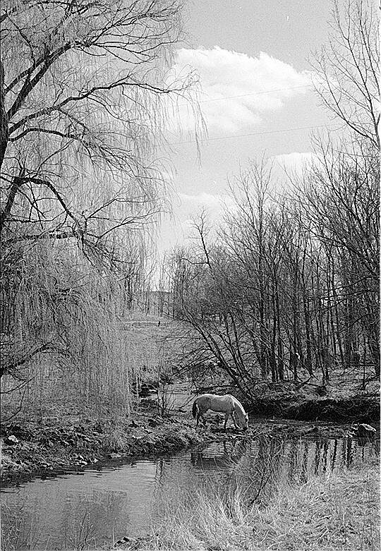 With ice gone from a small stream just south of the Schaefer Lake spillway near Hope, a white horse pauses for a drink on March 27, 1974.