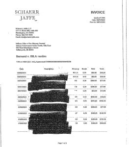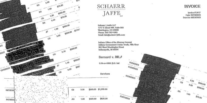 At issue are 44 pages of heavily-redacted attorney invoices from the Schaerr Jaffe law firm. The redactions were made by the Indiana Comptroller, who pays the invoices.