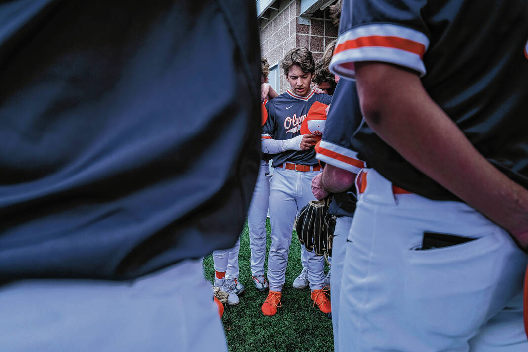 Columbus East’s Carson Williams leads his team in a prayer before a baseball game against Corydon Central at the Columbus East baseball and softball complex in Columbus, Ind., Friday, March 29, 2024.