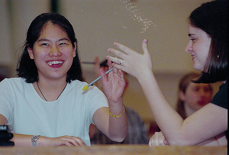 East junior Pearl Hwang, left, and junior Cassie Cagwin, members of the Fine Arts team, celebrate a point for the Columbus East Academic Team on March 31, 1999, at Hoosier Hills Conference Invitational Academic Super Bowl at East.