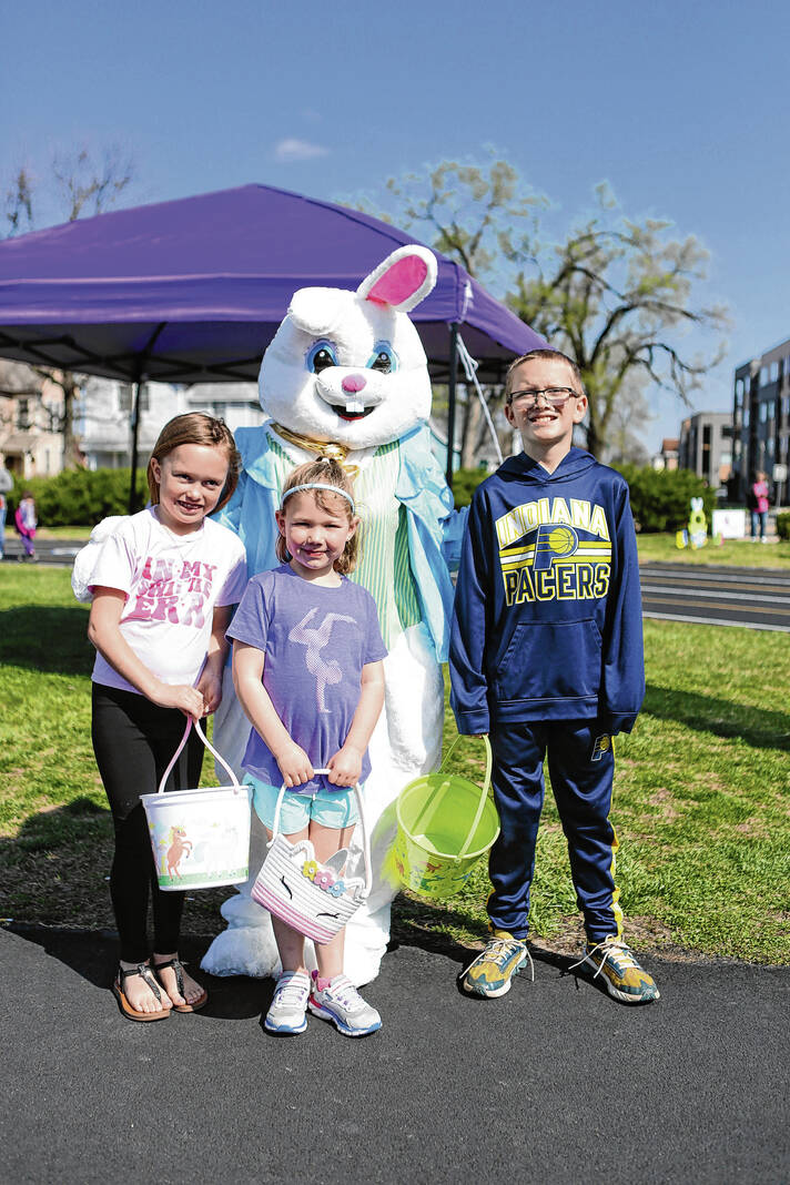 Carla Clark | For the Republic Adalynn Carman, Olivia Imel, and Isaiah Carman pose for a photograph with the Easter Bunny during the Emma Grace Foundation Easter egg hunt held at Central Middle School, Columbus, In., Saturday, March 30, 2024.