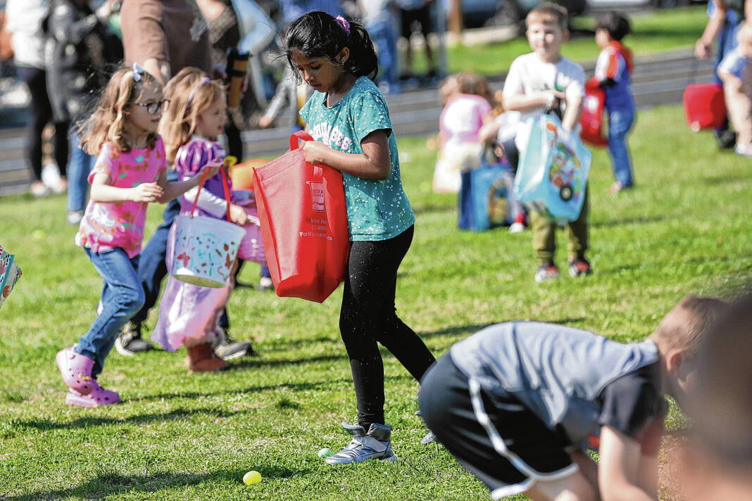 Carla Clark | For The Republic Diya Challatur, center, gathers eggs during the Emma Grace Foundation Easter egg hunt held at Central Middle School, Columbus, In., Saturday, March 30, 2024.