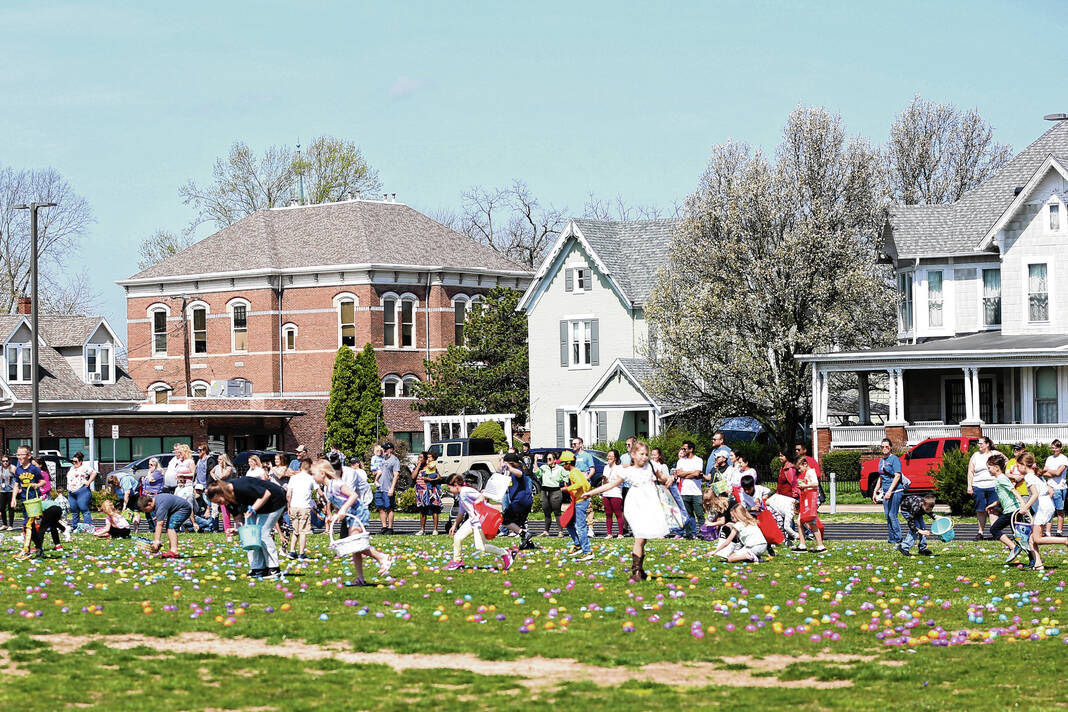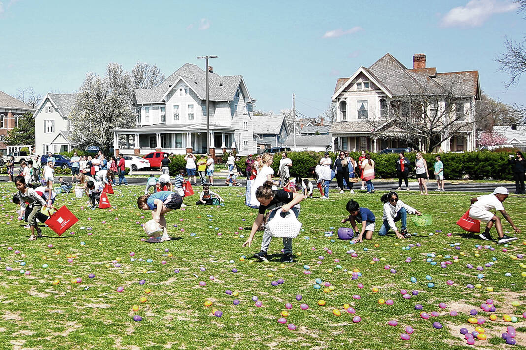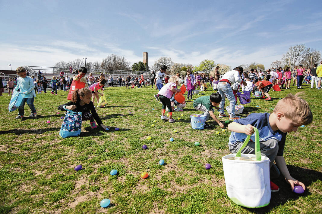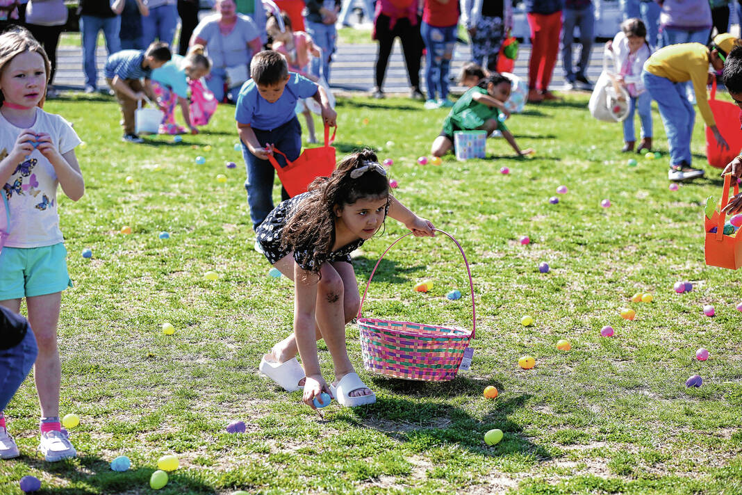 Carla Clark | For The Republic Children in the 4-6 age group gather eggs during the Emma Grace Foundation Easter egg hunt held at Central Middle School, Columbus, In., Saturday, March 30, 2024.