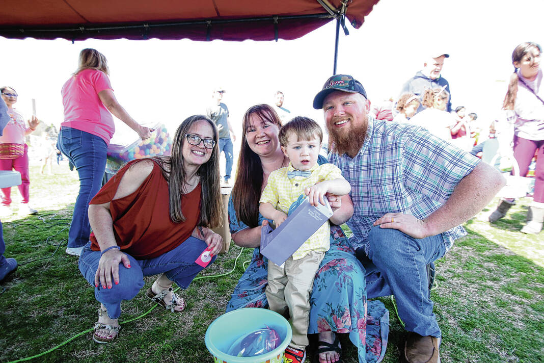 Carla Clark | For The Republic Linsey Sweet, mother of Emma Grace Sweet, at left, poses with Duston Christy, the golden egg prize winner for the 0-3 age group, and Krista Christy and Kenneth Christy during the Emma Grace Foundation Easter egg hunt held at Central Middle School, Columbus, In., Saturday, March 30, 2024.