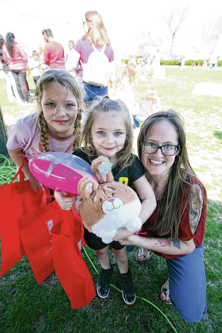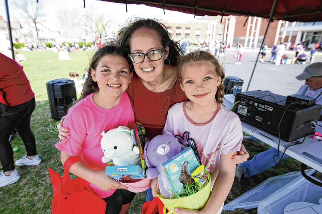 Carla Clark | For The Republic Zoe Berger, at left, poses for a photograph with her sister, Brysta Berger, a golden egg winner, and Linsey Sweet, mother of Emma Grace Sweet, during the Emma Grace Foundation Easter egg hunt held at Central Middle School, Columbus, In., Saturday, March 30, 2024.