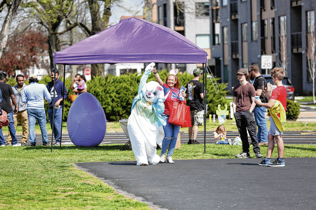 Carla Clark | For The Republic The Easter Bunny dances with Samantha Ison, of Shelter Insurance, during the Emma Grace Foundation Easter egg hunt held at Central Middle School, Columbus, In., Saturday, March 30, 2024.
