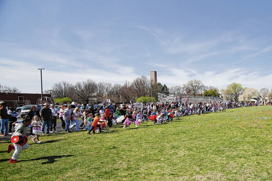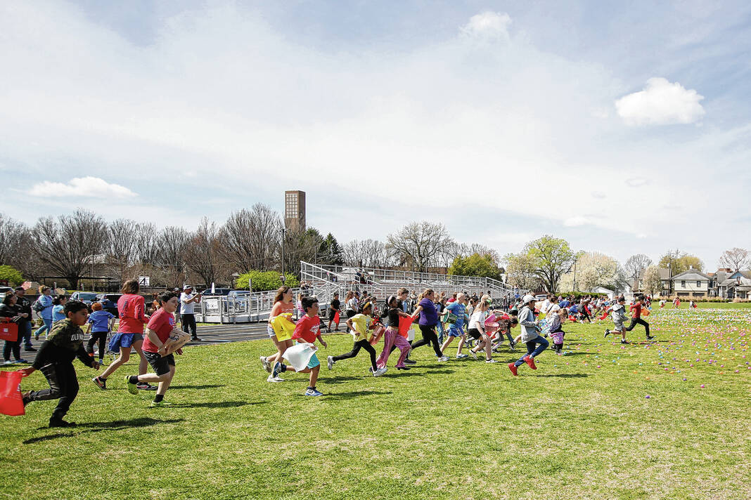 Carla Clark | For The Republic Children in the 4-6 age group race to gather eggs during the Emma Grace Foundation Easter egg hunt held at Central Middle School, Columbus, In., Saturday, March 30, 2024.