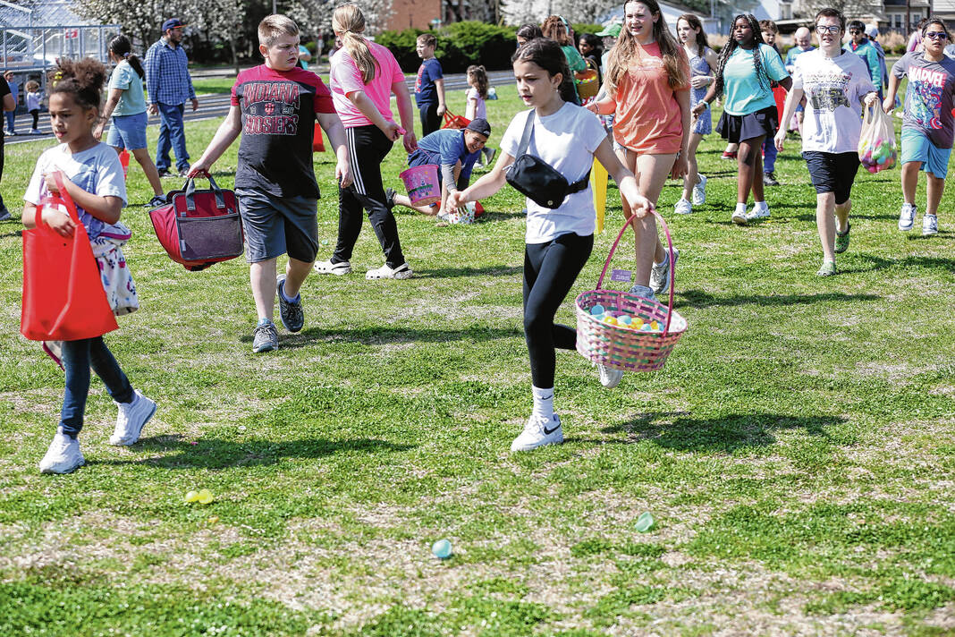 Carla Clark | For The Republic Children in the 10-12 age group head back with bags and baskets full of eggs during the Emma Grace Foundation Easter egg hunt held at Central Middle School, Columbus, In., Saturday, March 30, 2024.
