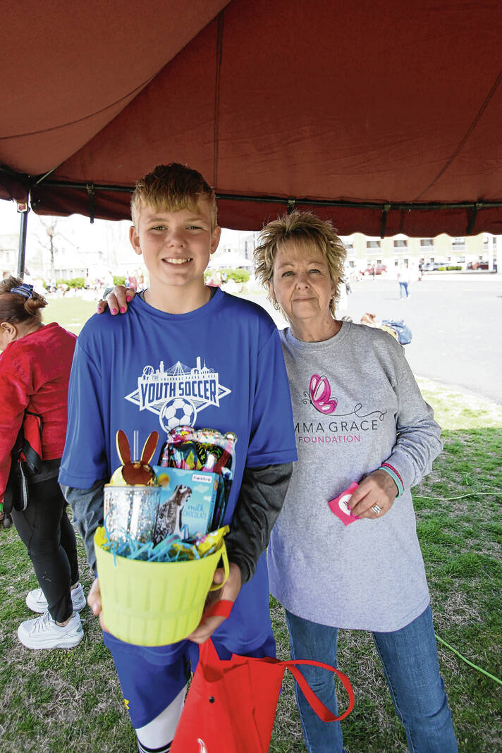 Carla Clark | For The Republic Kylo Eudy, a golden egg winner, at left, poses for a photograph with Melodee Hand, grandmother of Emma Grace Sweet, during the Emma Grace Foundation Easter egg hunt held at Central Middle School, Columbus, In., Saturday, March 30, 2024.