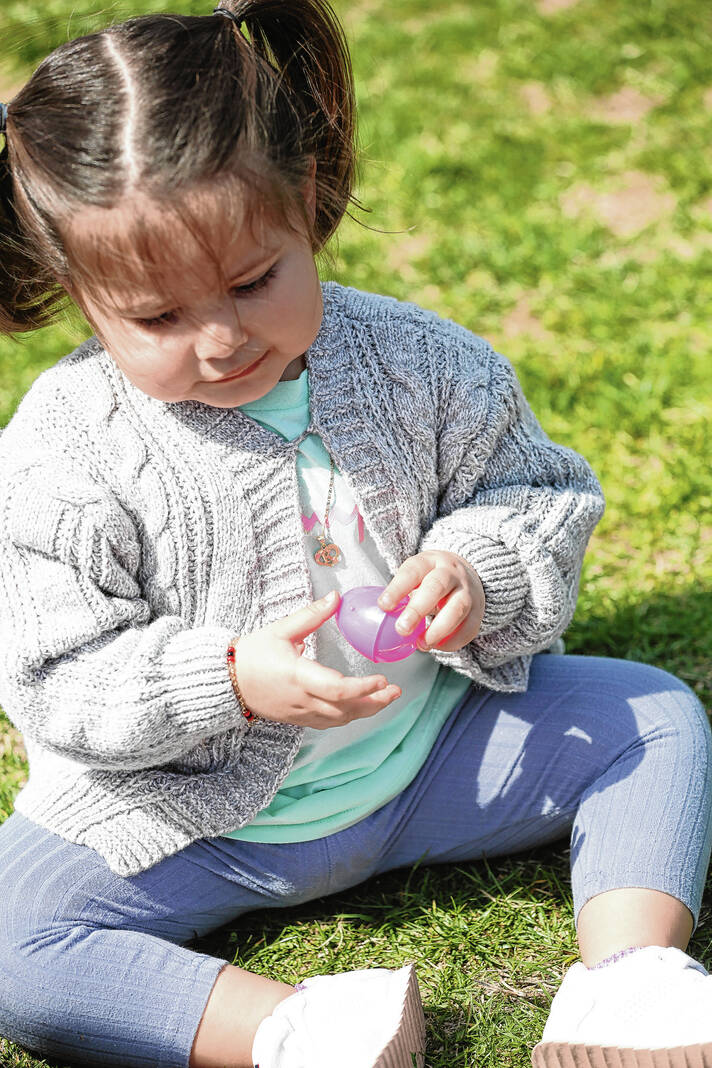 Carla Clark | For The Republic Keyla Jimenez plays with one of her eggs during the Emma Grace Foundation Easter egg hunt held at Central Middle School, Columbus, In., Saturday, March 30, 2024.