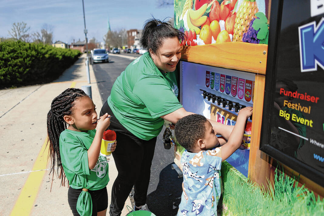 Carla Clark | For The Republic Sophia Sagesse, from left, Ashleigh Sagesse and Caspen Sagesse at the Kona Ice truck during the Emma Grace Foundation Easter egg hunt held at Central Middle School, Columbus, In., Saturday, March 30, 2024.