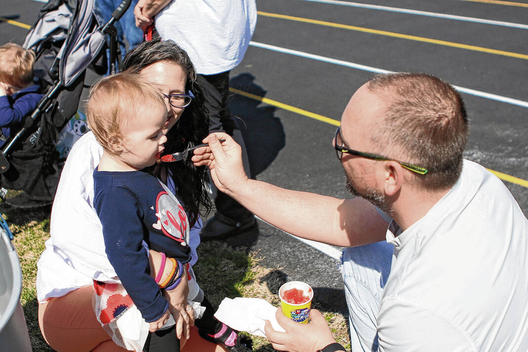 Carla Clark | For The Republic Angel Mack watches as Brooklee Mack is fed Kona Ice by Steven Huntington during the Emma Grace Foundation Easter egg hunt held at Central Middle School, Columbus, In., Saturday, March 30, 2024.
