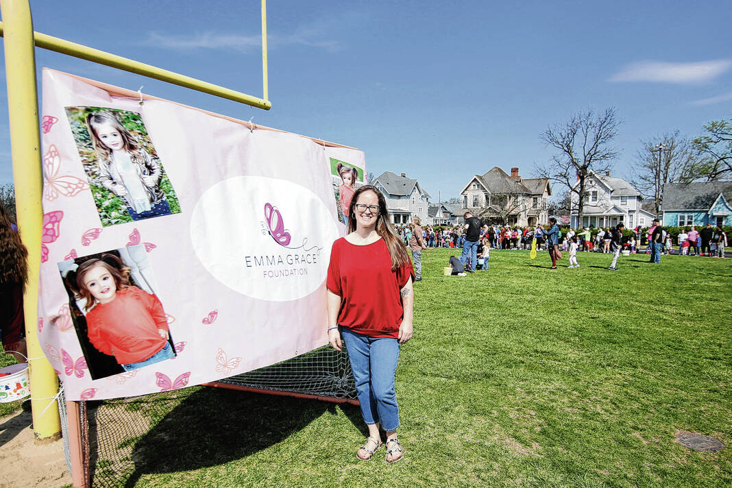 Carla Clark | For The Republic Linsey Sweet, mother of Emma Grace Sweet, poses for a photograph in front of a sign during the Emma Grace Foundation Easter egg hunt held at Central Middle School, Columbus, In., Saturday, March 30, 2024.