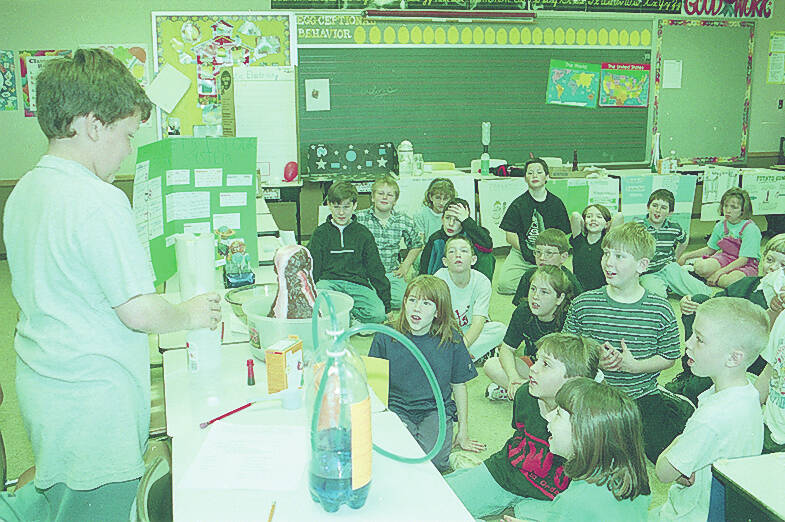 At left, Christopher Anderson of Hope Elementary School demonstrates his science project in front of Julie Swegman’s third-grade class on April 7, 1999. Anderson used baking soda, vinegar and food coloring to simulate an erupting volcano.