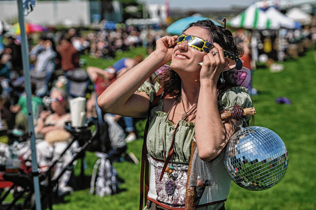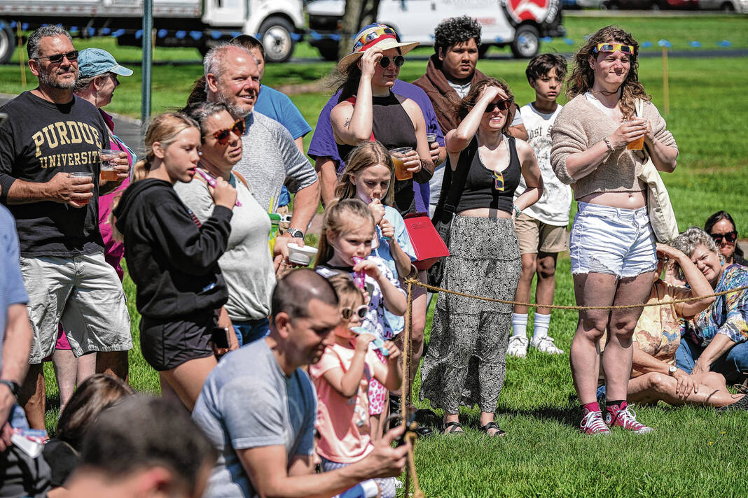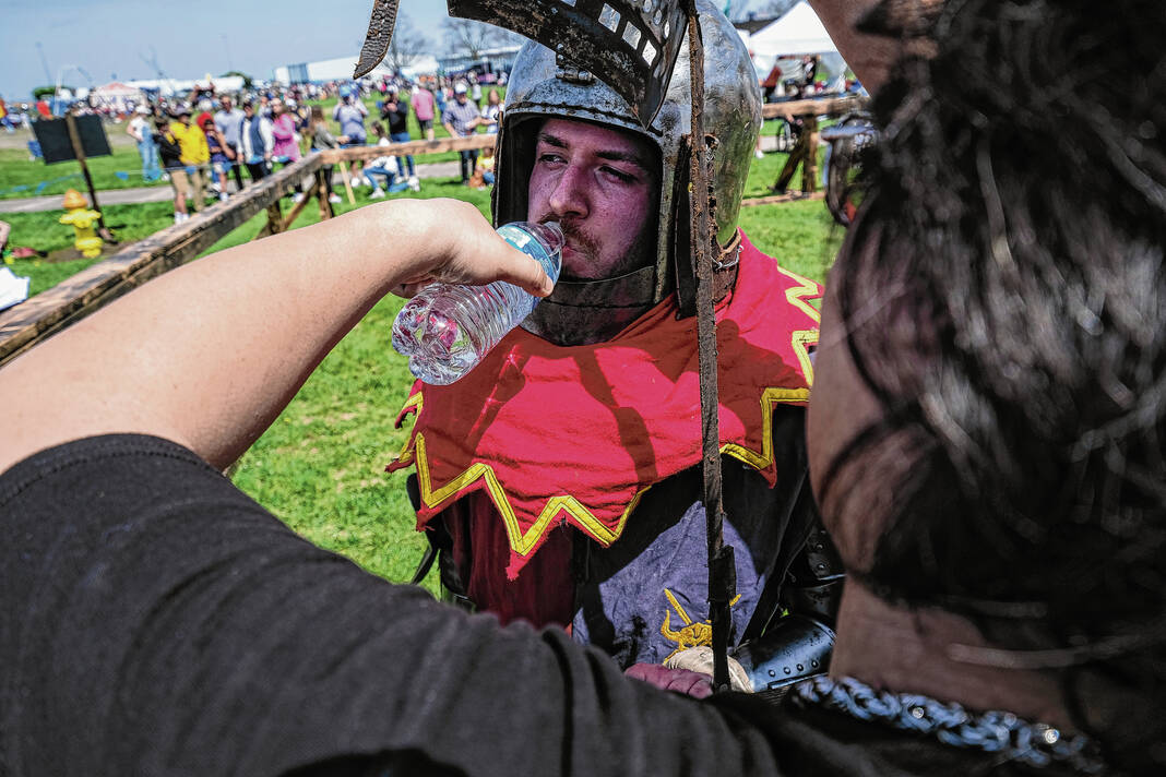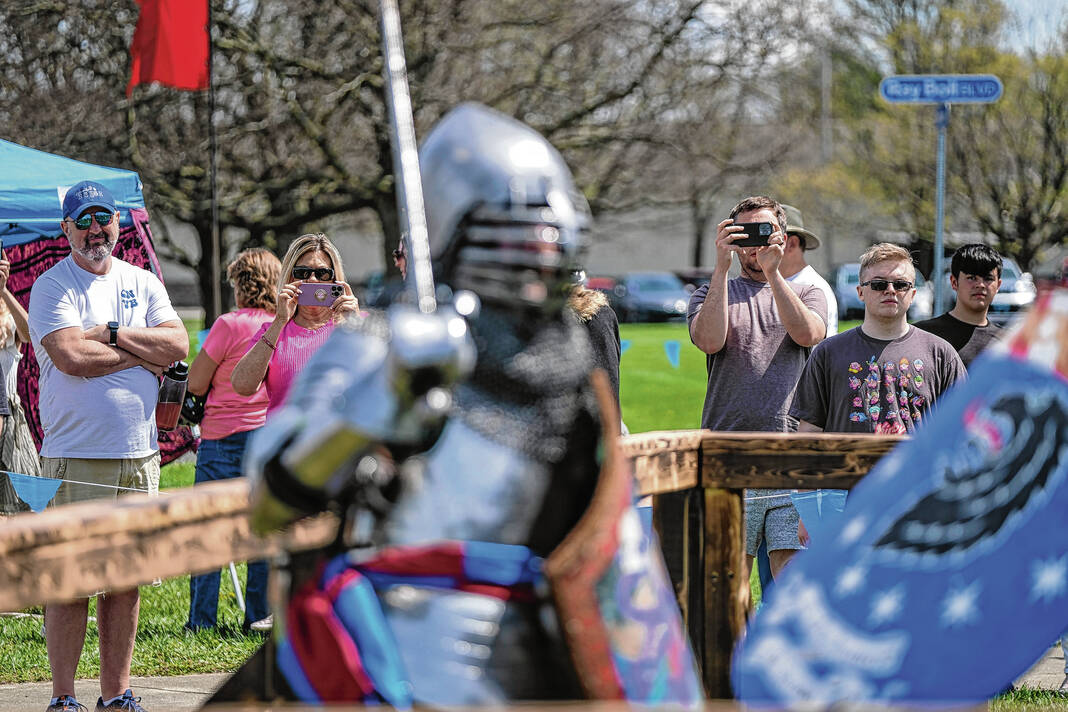 Mike Wolanin | The Republic Spectators watch armored combat during the Eclipsing the Renaissance eclipse viewing event at the Columbus Airport Airpark in Columbus, Ind., Monday, April 8, 2024.