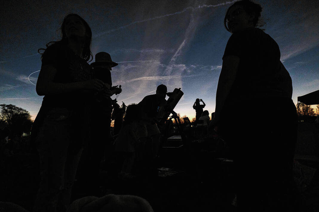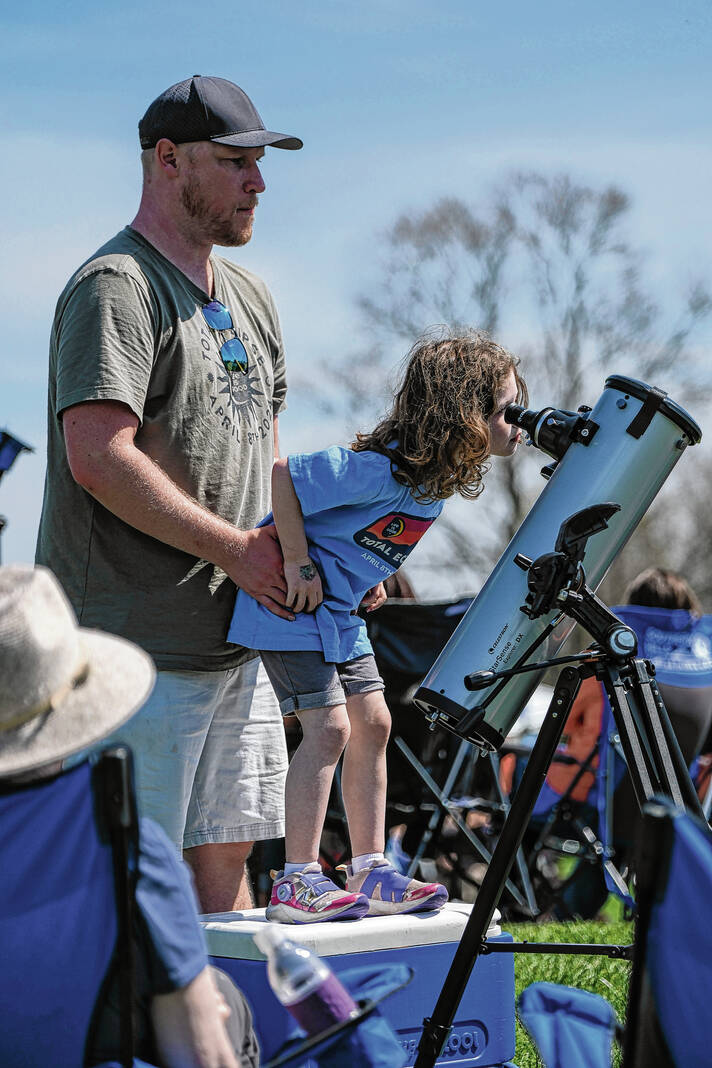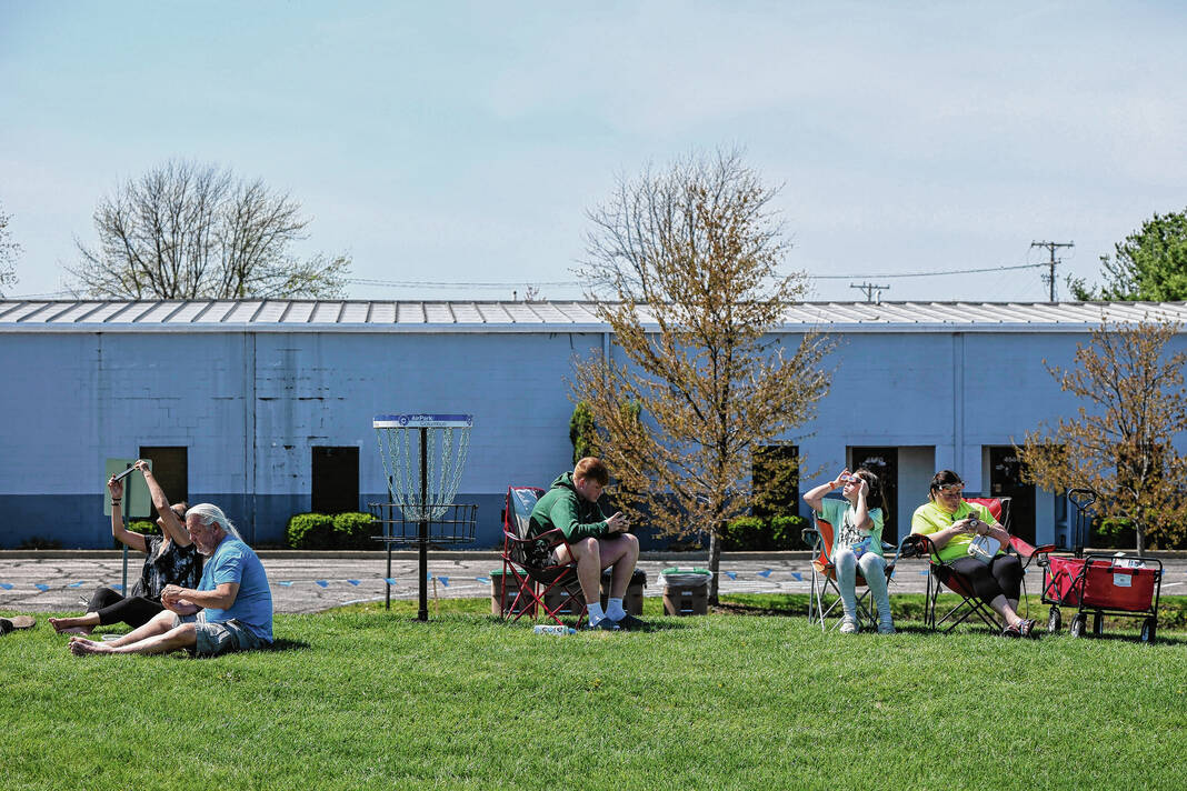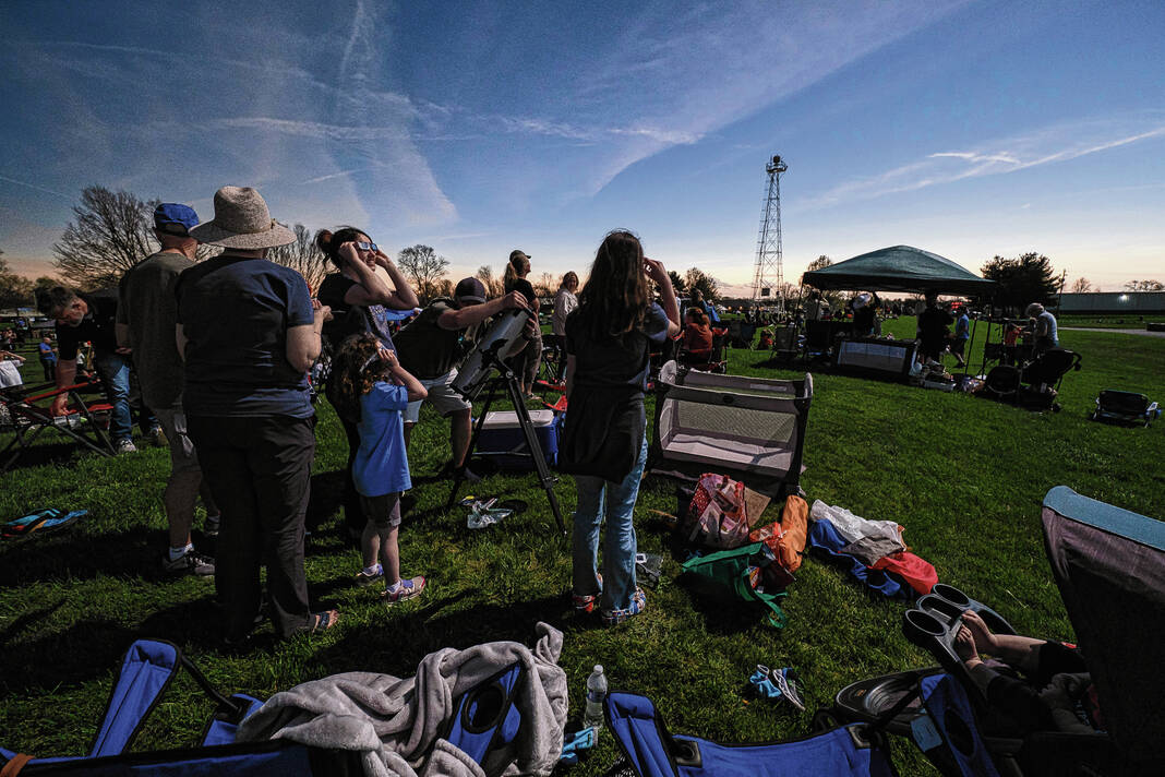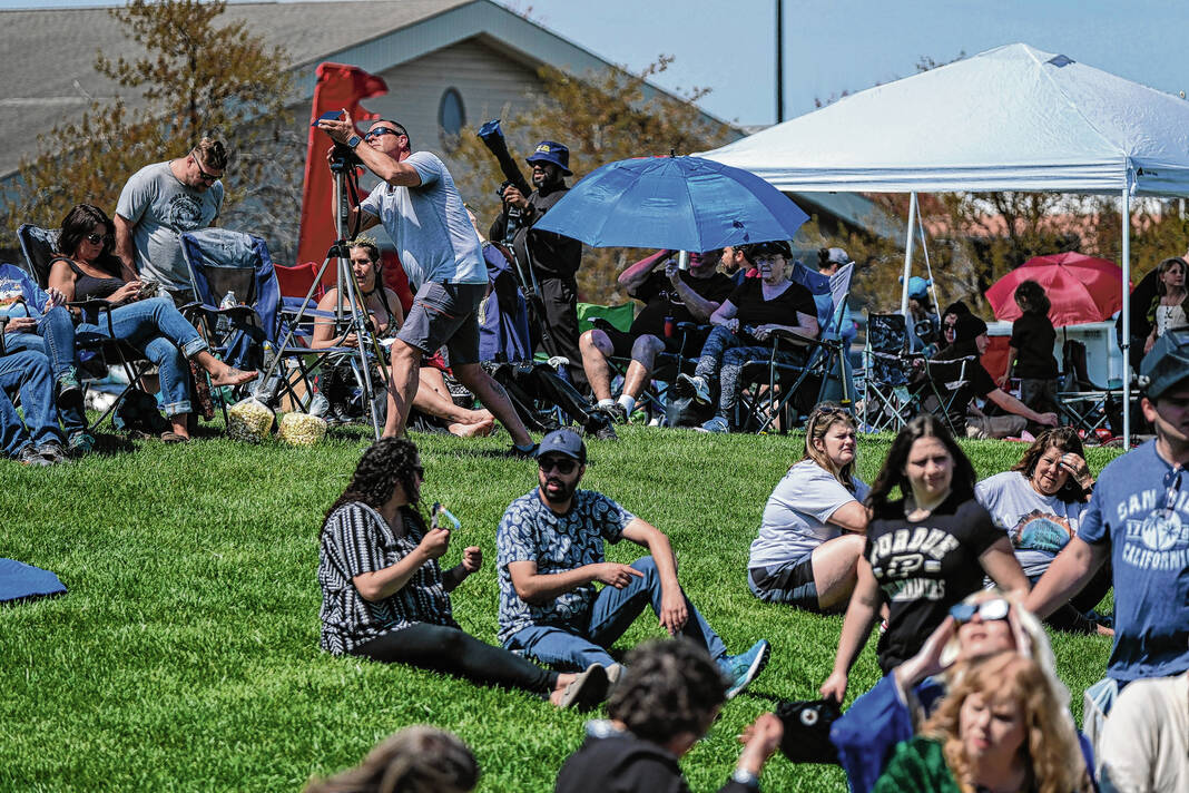 Mike Wolanin | The Republic Spectators watch armored combat during the Eclipsing the Renaissance eclipse viewing event at the Columbus Airport Airpark in Columbus, Ind., Monday, April 8, 2024.