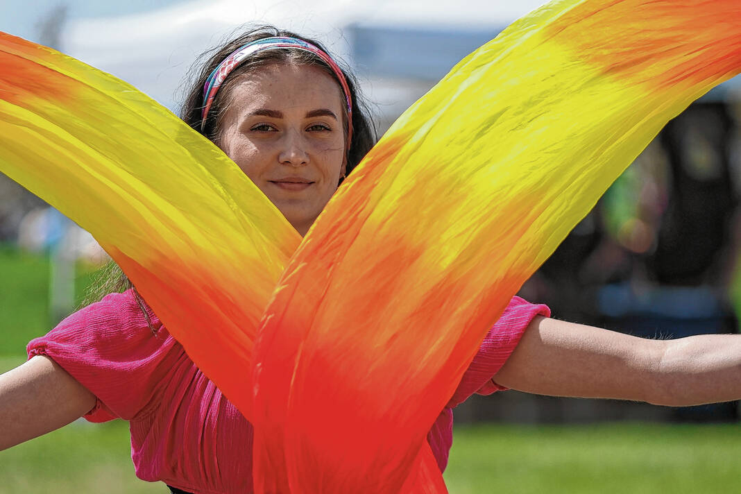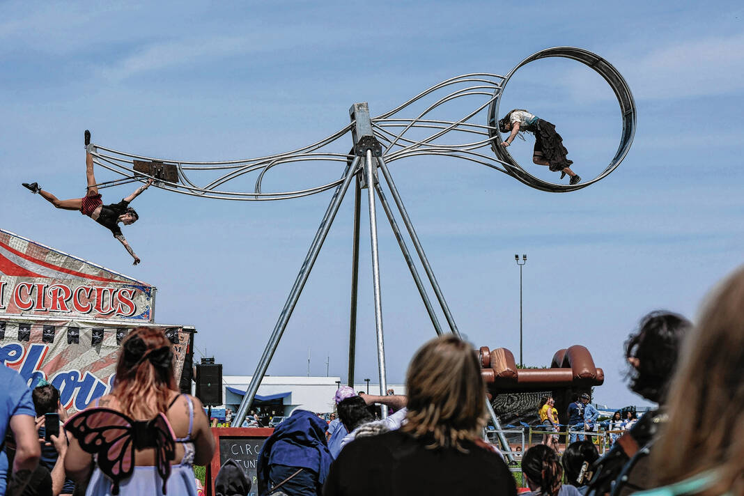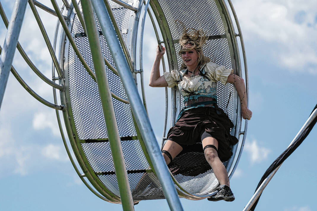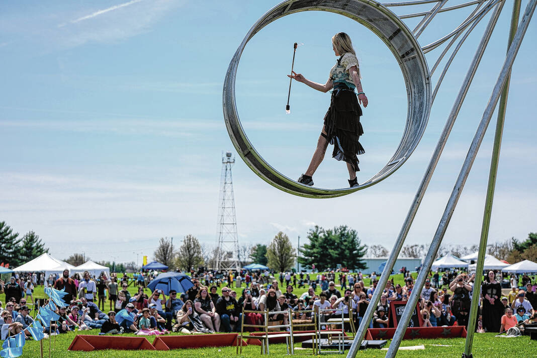 Fire eater Kristina Burroughs with the Cincinnati Circus walked the grounds early in the event somewhat concerned that partially gusting winds could endanger her performance. But she maintained her sense of humor.