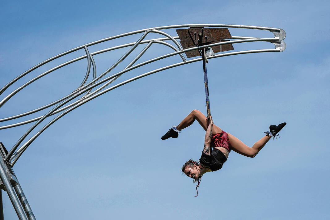 As Burroughs spoke, an aerialist was flipping and spinning artfully on hanging scarves to the applause of about 200 people seated all around the stage. At the other end of the grounds, a bazaar featured vendors selling everything from candles to carvings. The lemon shakeup line stretched 25 people near the food booths.