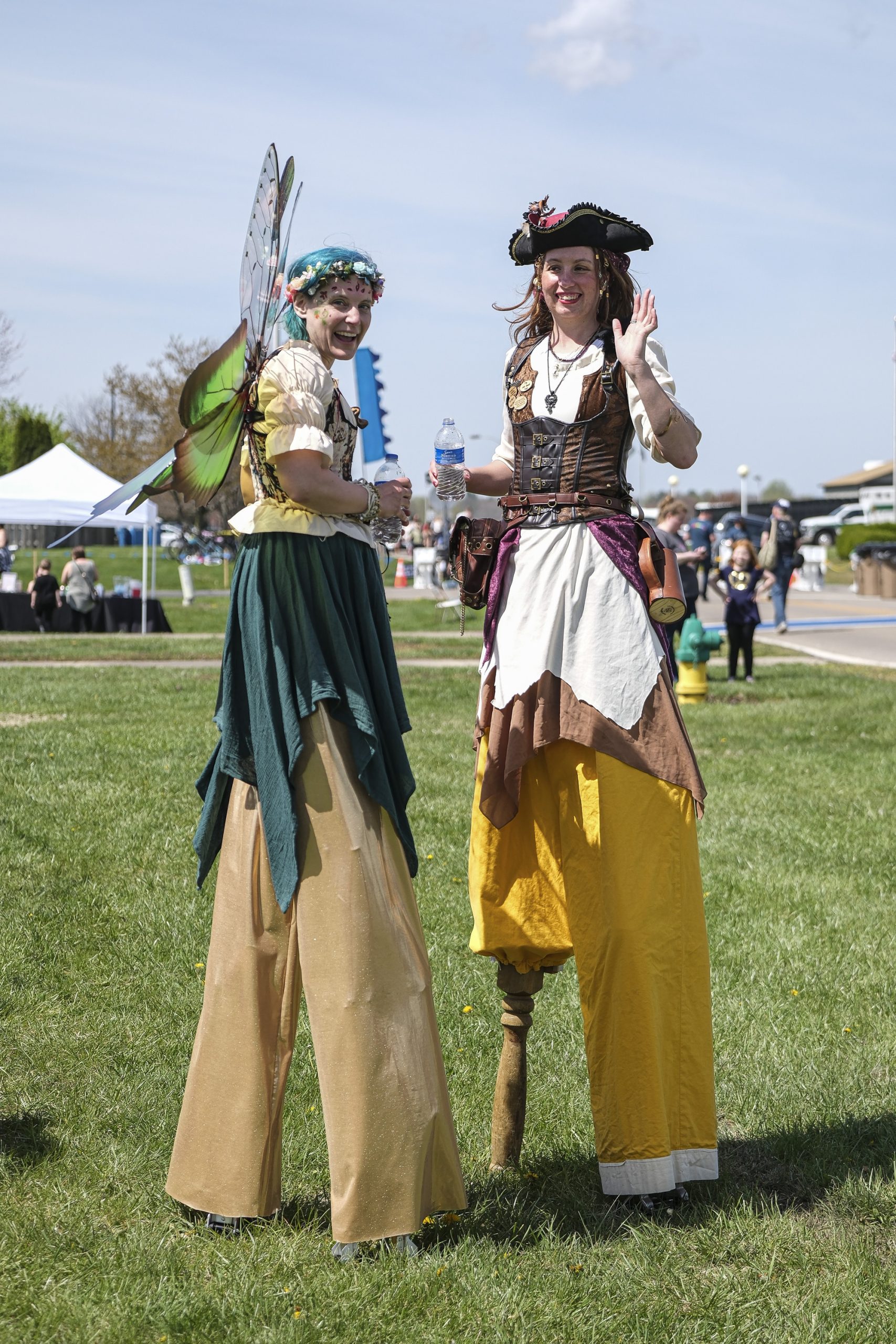 Angie Austin, left, and Lindsey Marriott, with the Cincinnati Circus, stand on stilts as they get ready to perform at the Eclipsing the Renaissance eclipse viewing event at the Columbus Airport Airpark in Columbus, Ind., Monday, April 8, 2024.