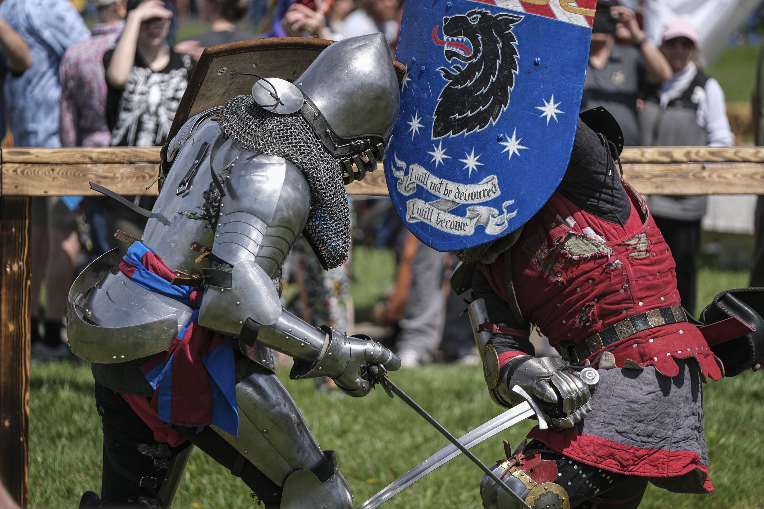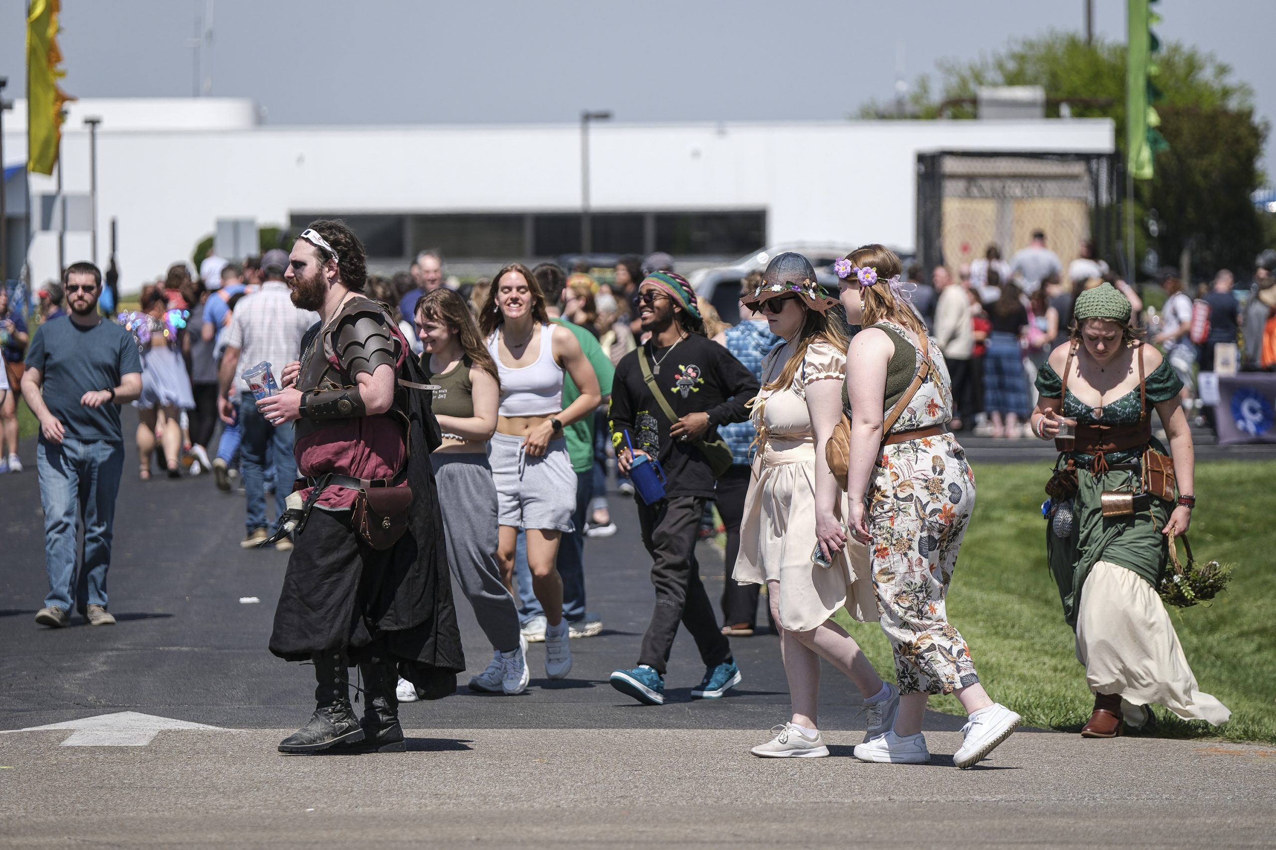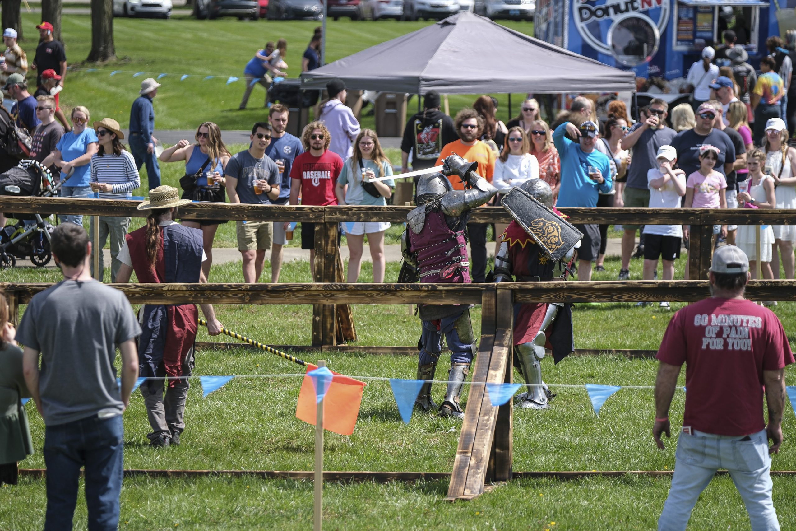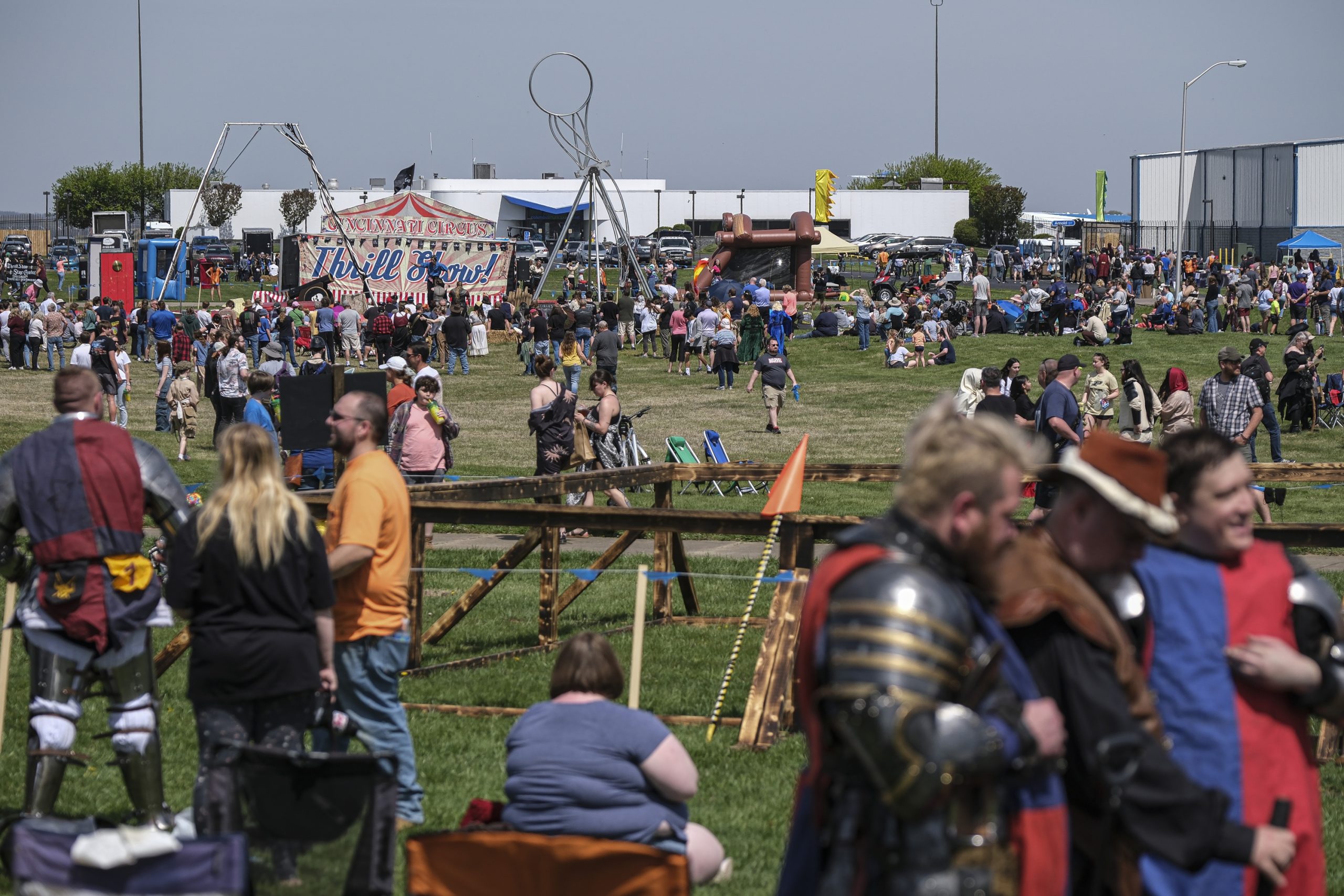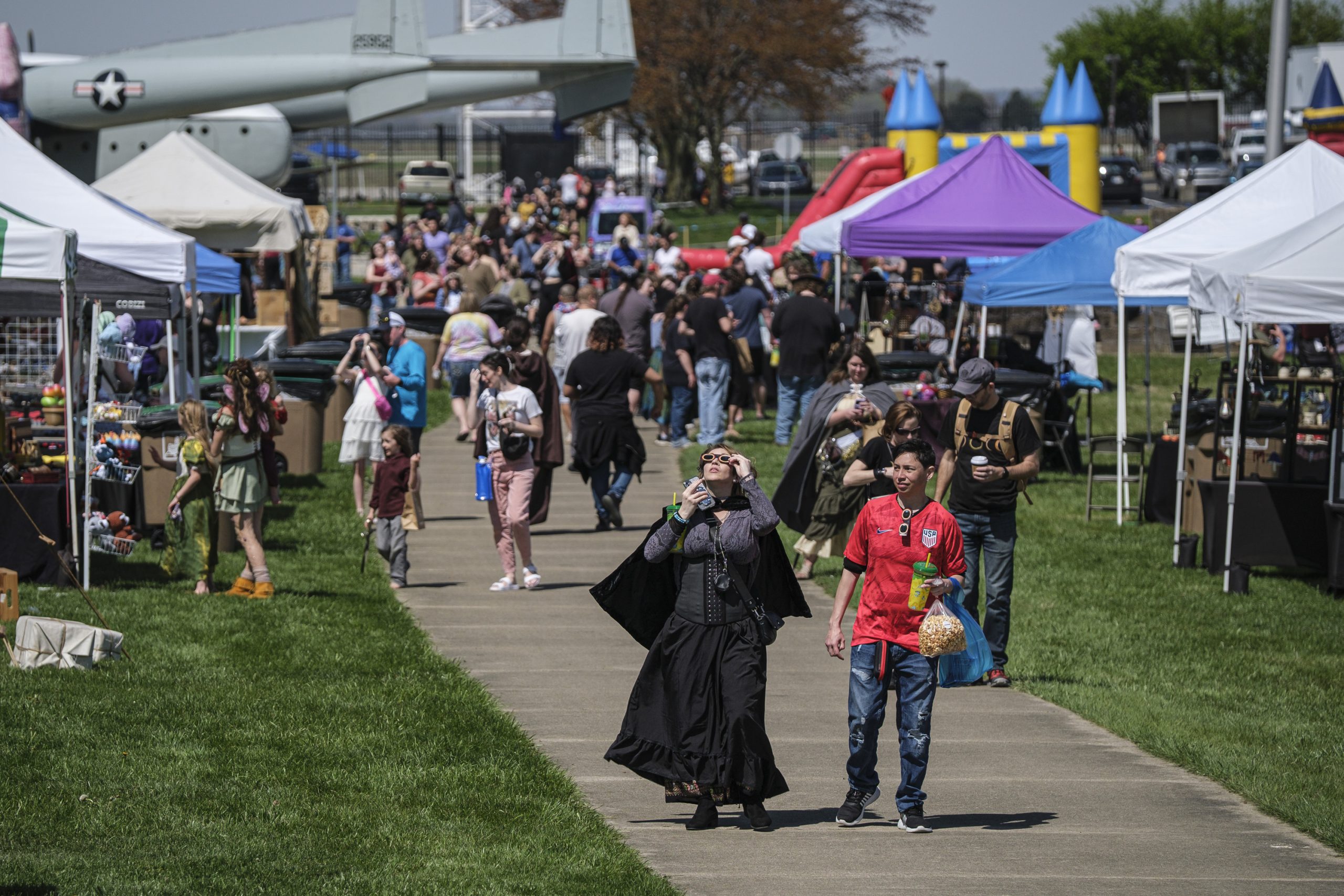 Spectators watch armored combat during the Eclipsing the Renaissance eclipse viewing event at the Columbus Airport Airpark in Columbus, Ind., Monday, April 8, 2024.