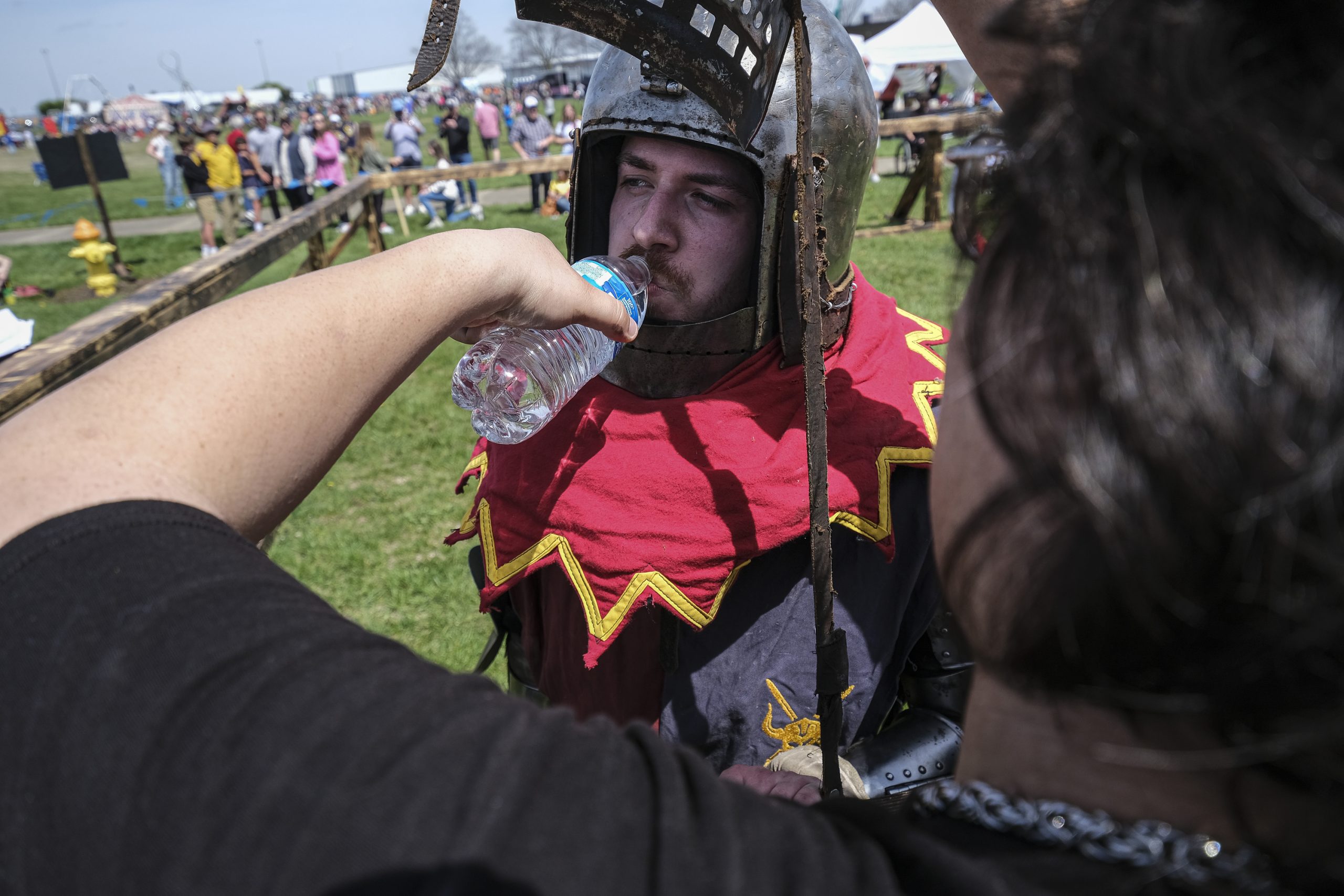 Matthew Koerner, left, gets a drink of water from Aaron Berrios after his armored combat match during the Eclipsing the Renaissance eclipse viewing event at the Columbus Airport Airpark in Columbus, Ind., Monday, April 8, 2024.
