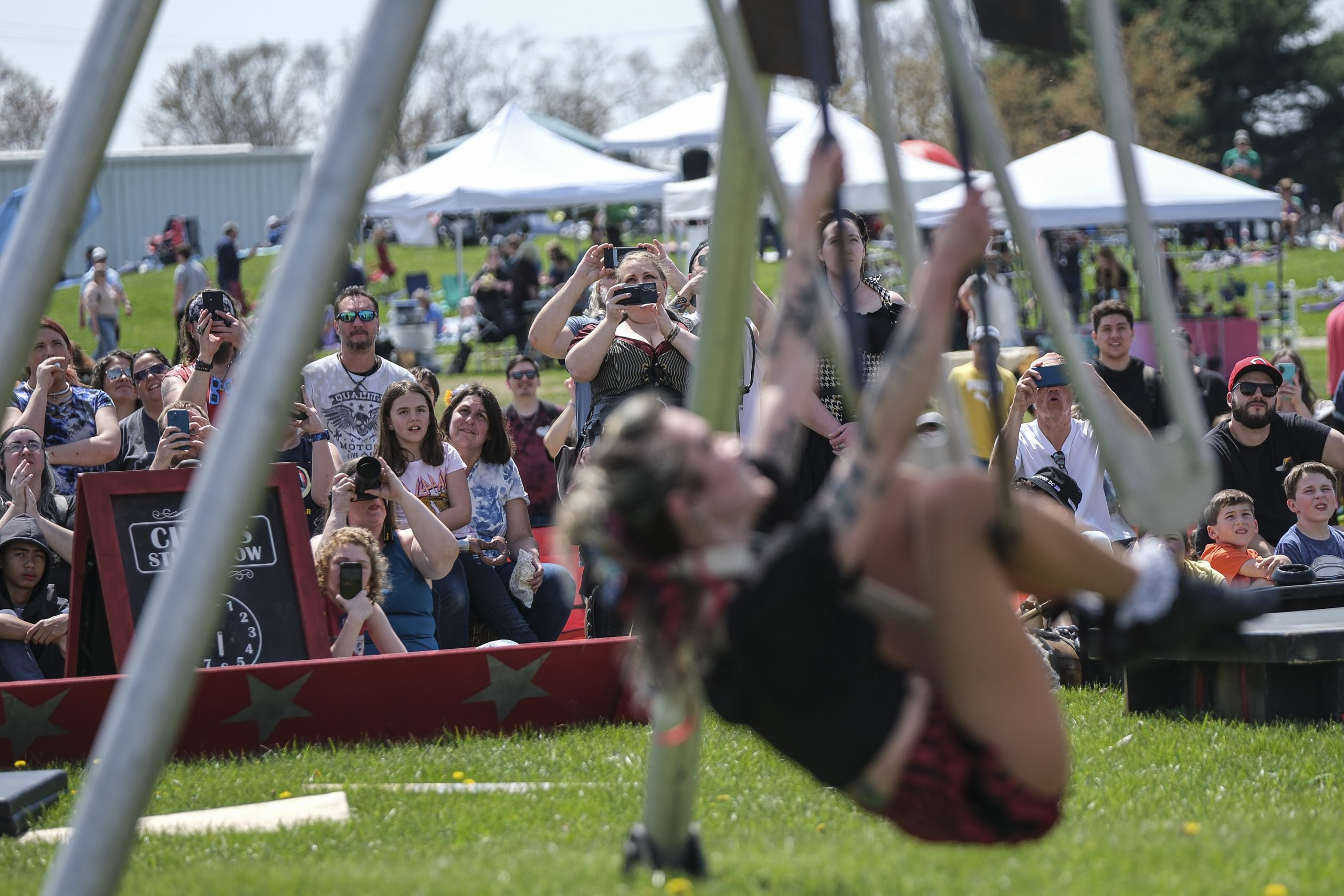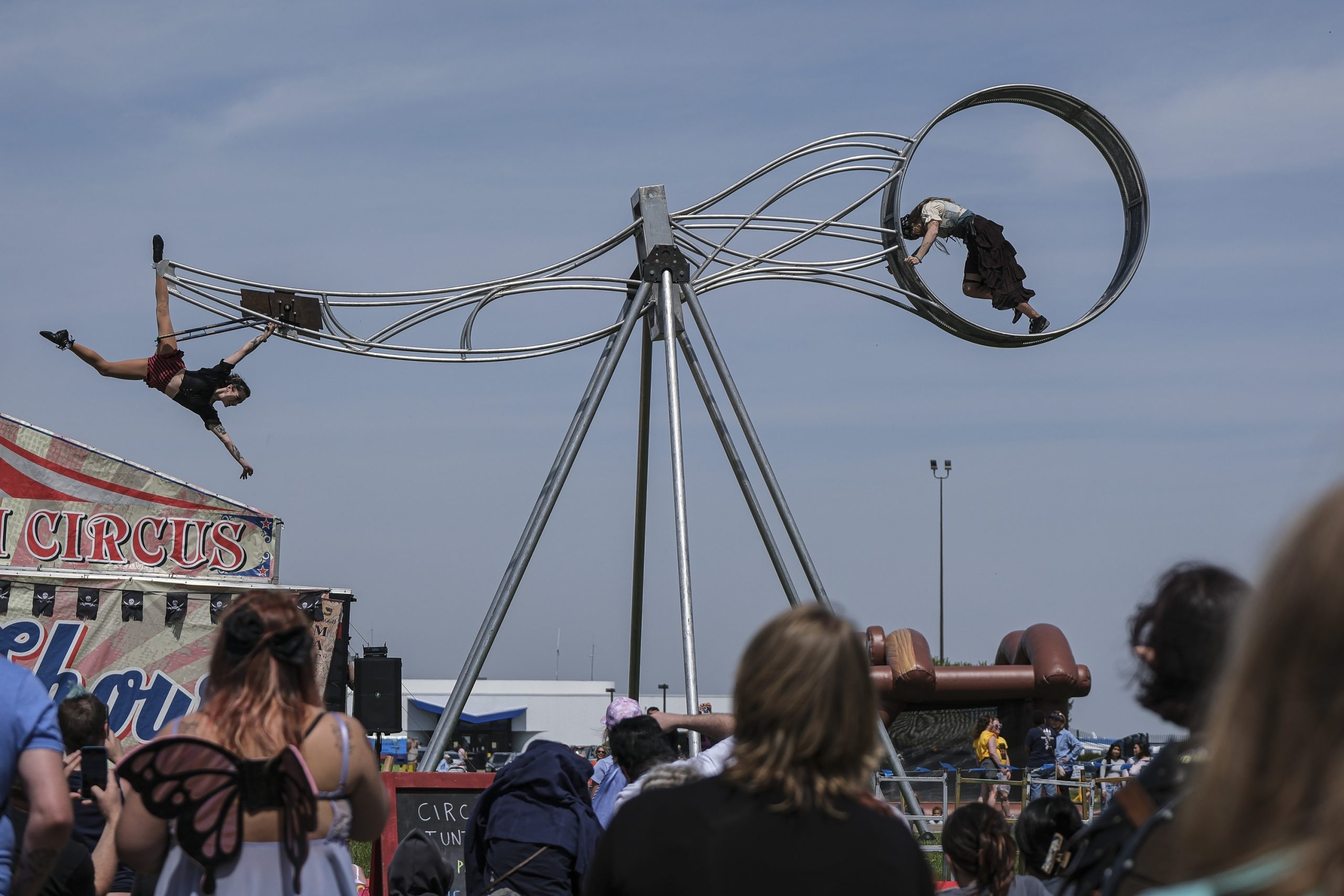Spectators watch Gia Bolton and Ali Shepard, with the Cincinnati Circus, perform during the Eclipsing the Renaissance eclipse viewing event at the Columbus Airport Airpark in Columbus, Ind., Monday, April 8, 2024.