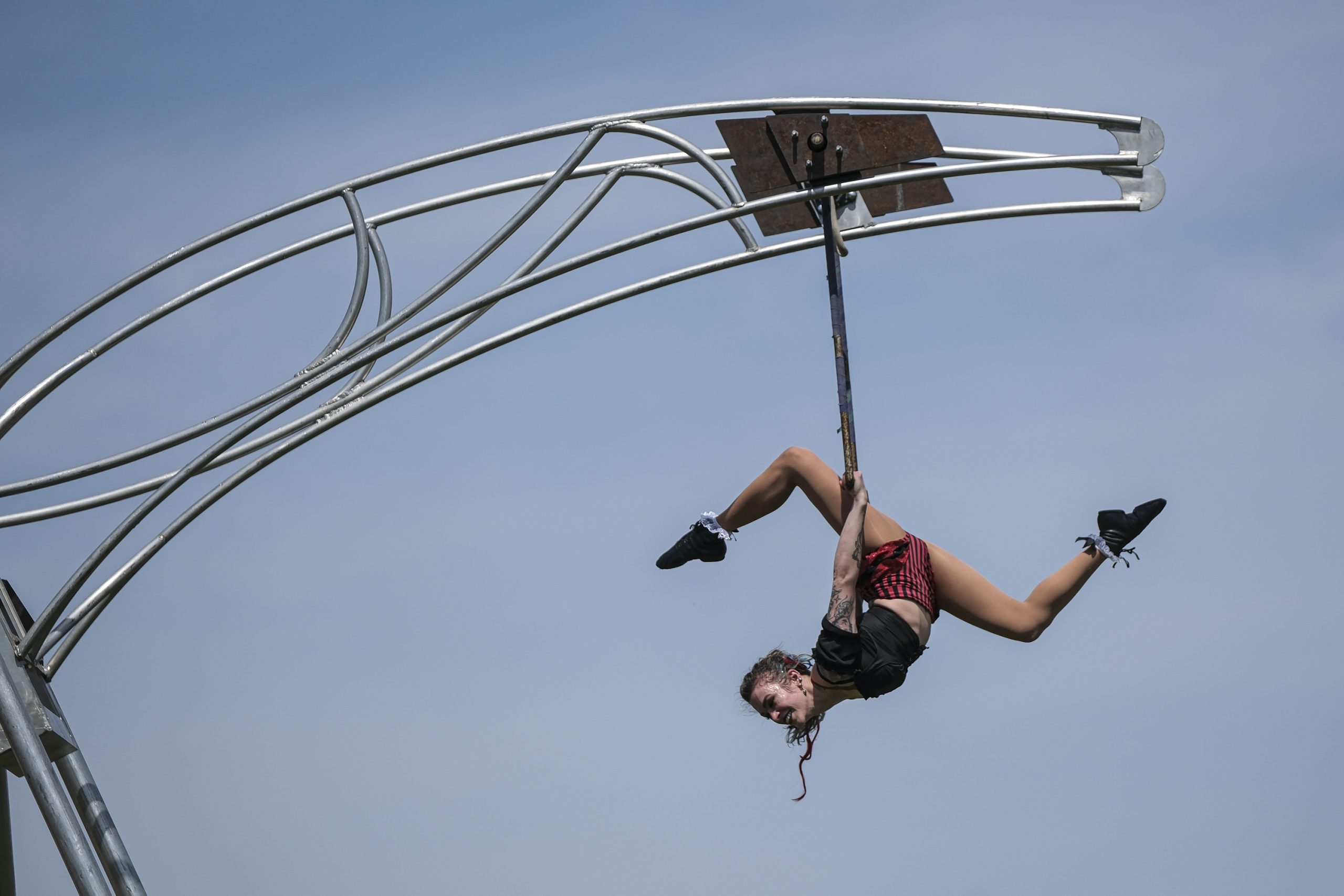 Ali Shepard, with the Cincinnati Circus, performs during the Eclipsing the Renaissance eclipse viewing event at the Columbus Airport Airpark in Columbus, Ind., Monday, April 8, 2024.