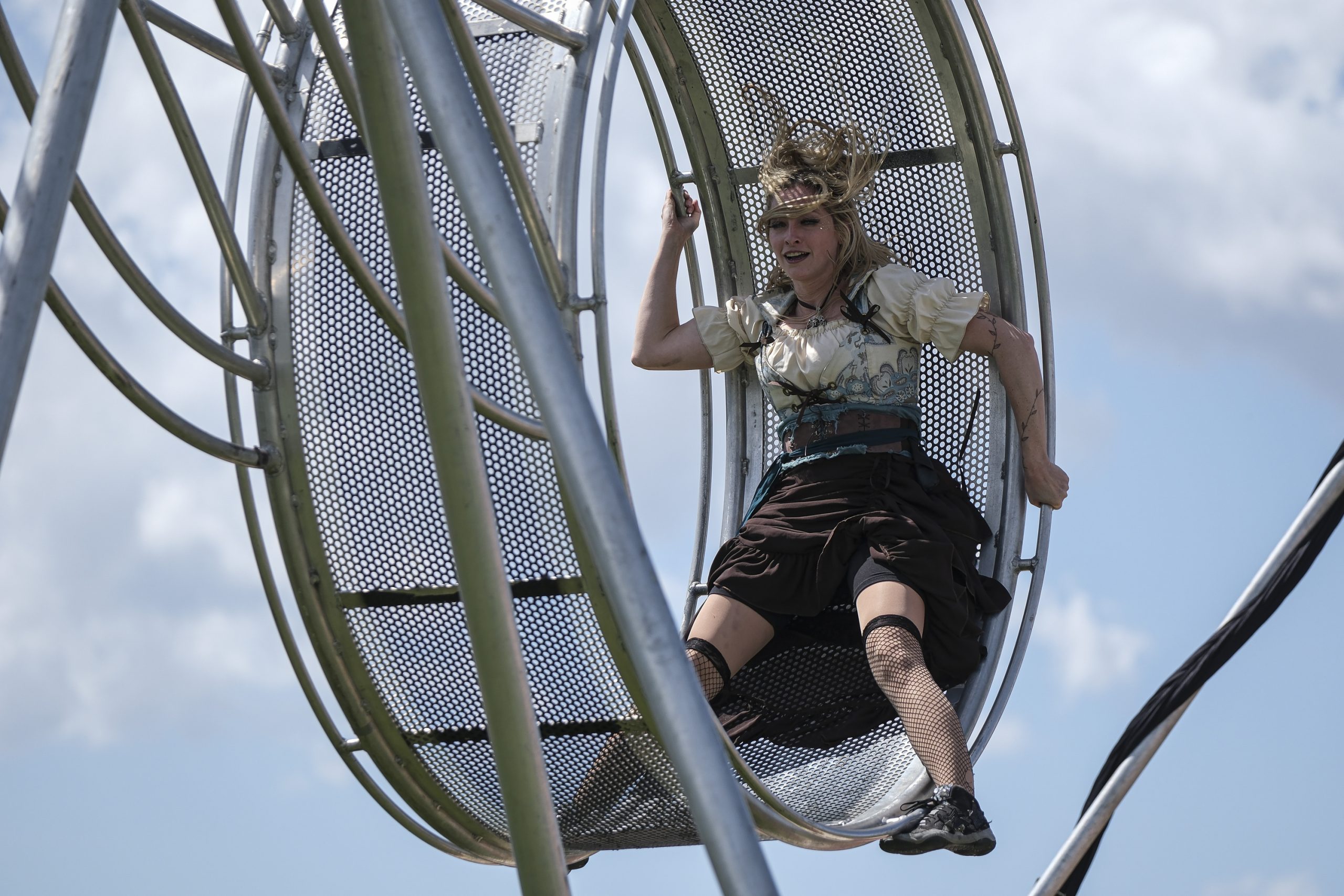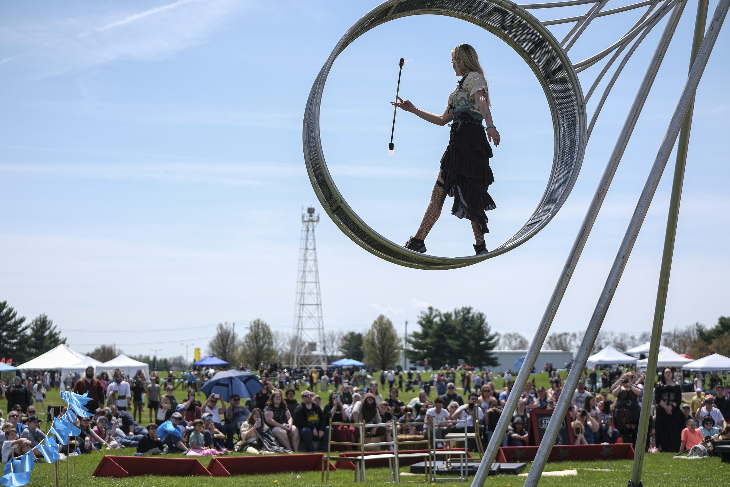 Ciara Nichols, with the Cincinnati Circus, performs during the Eclipsing the Renaissance eclipse viewing event at the Columbus Airport Airpark in Columbus, Ind., Monday, April 8, 2024.