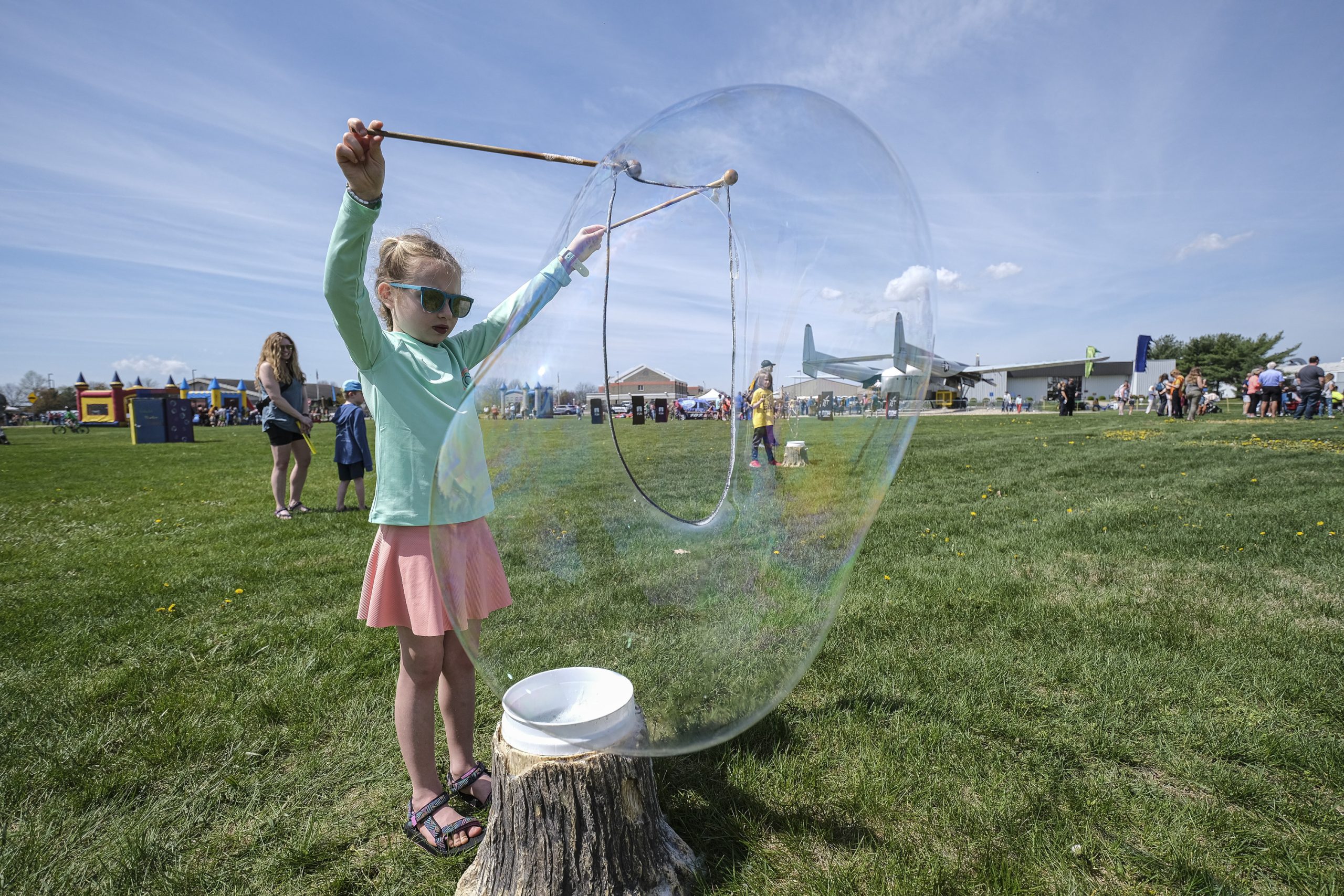 Lucy Aciukewicz makes a giant bubble during the Eclipsing the Renaissance eclipse viewing event at the Columbus Airport Airpark in Columbus, Ind., Monday, April 8, 2024.