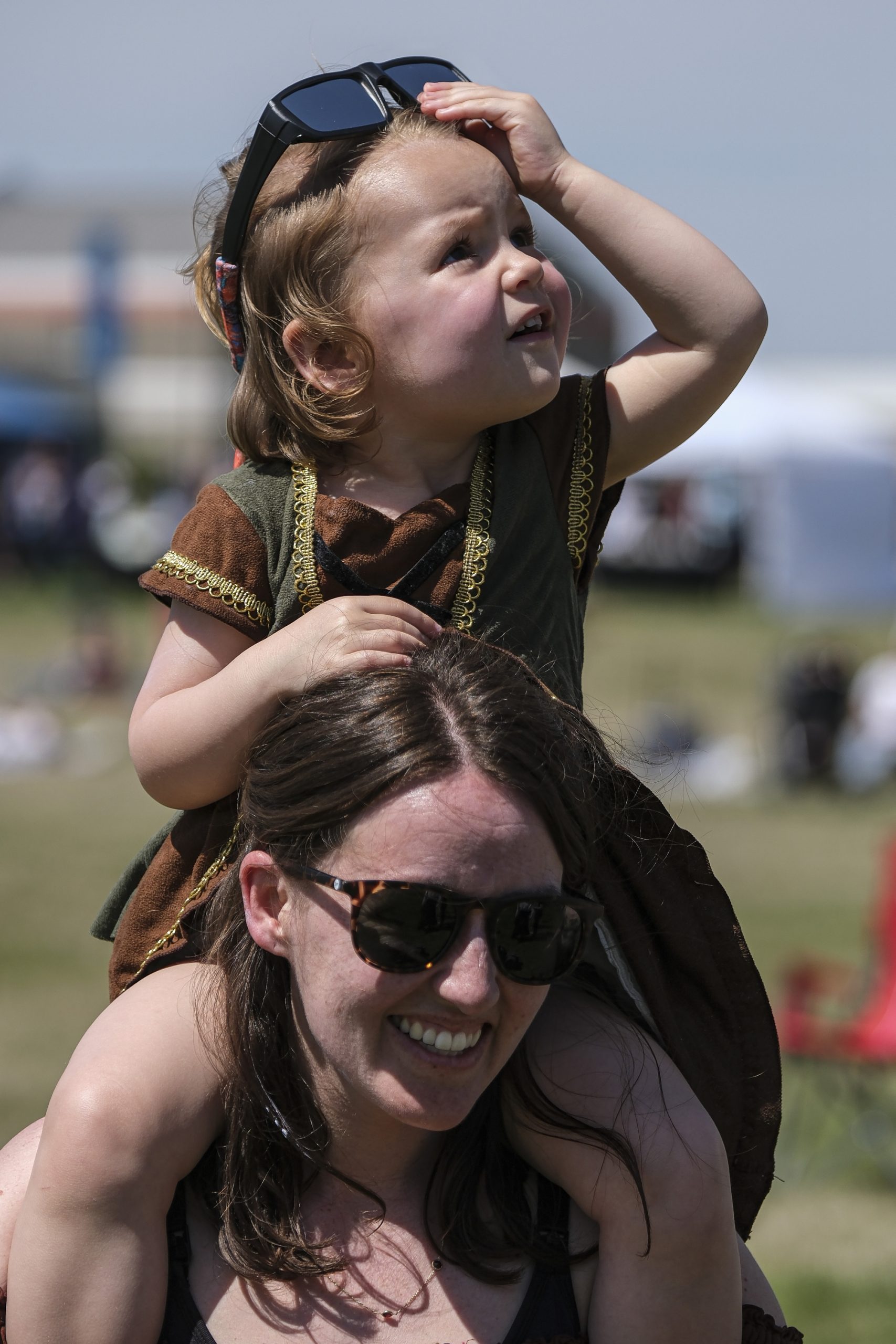 Genevieve Giffin and her daughter Alida attend the Eclipsing the Renaissance eclipse viewing event to watch the total solar eclipse at the Columbus Airport Airpark in Columbus, Ind., Monday, April 8, 2024.