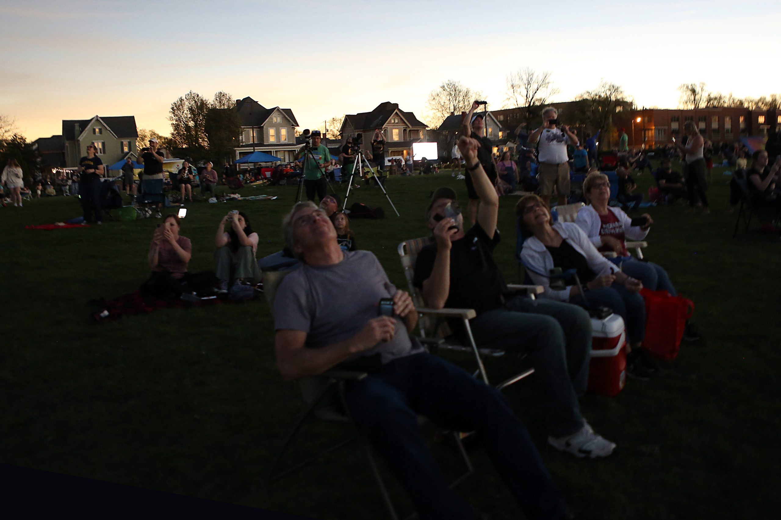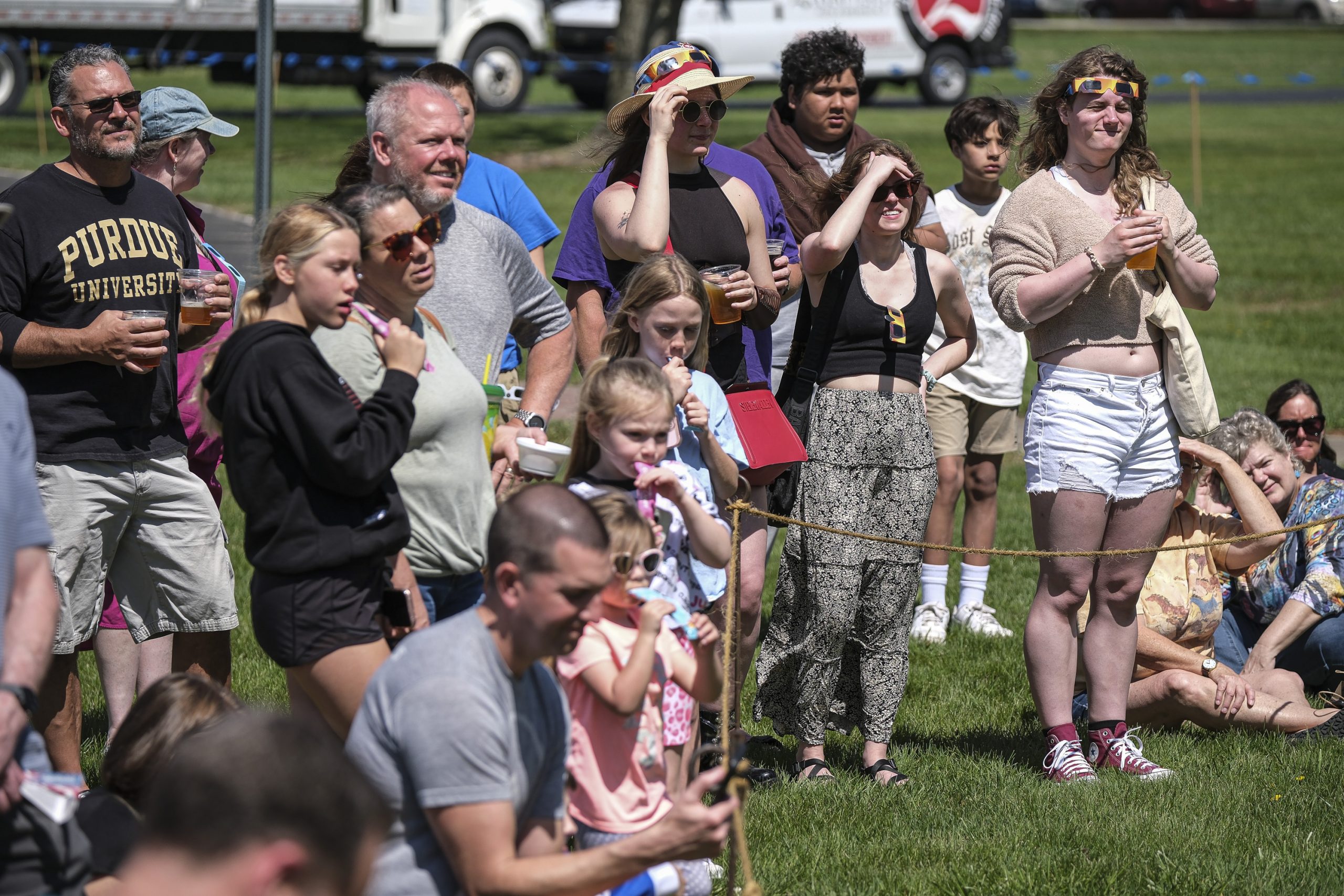 People watch as the eclipse nears totality during the Solar Spectactular Eclipse Viewing Party hosted by kidscommons and the Bartholomew County Public Library at Central Middle School, Columbus, Ind., Monday April 8, 2024.