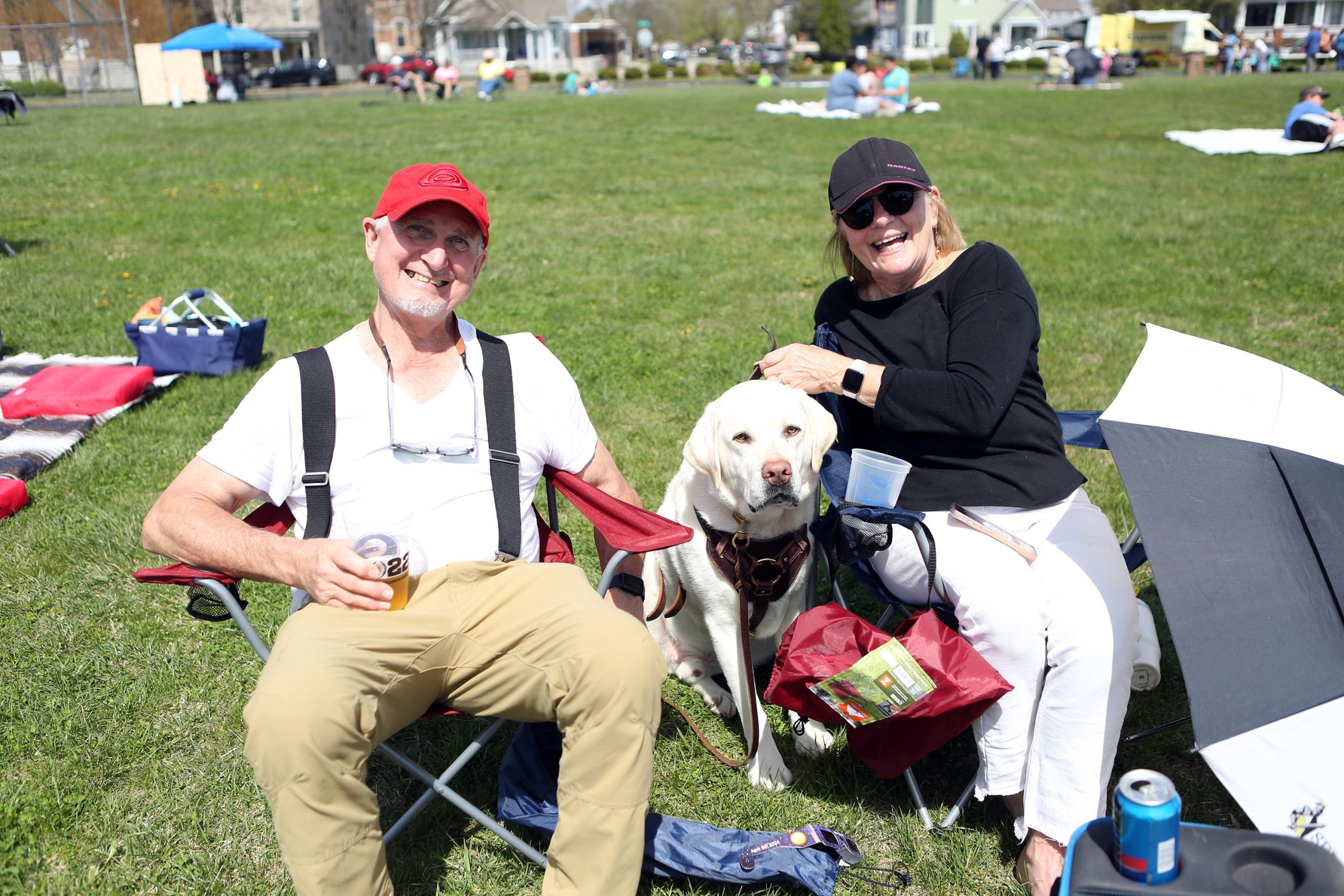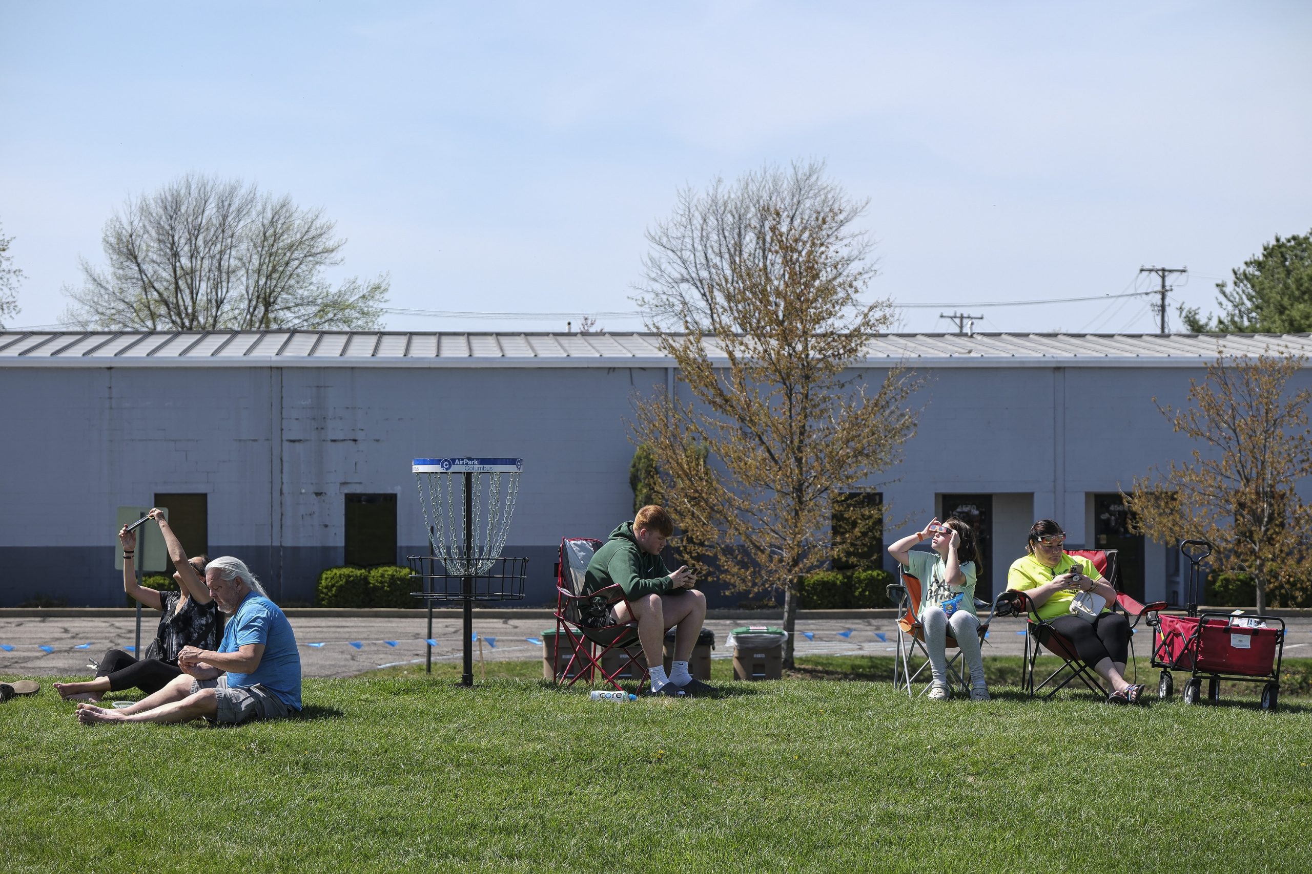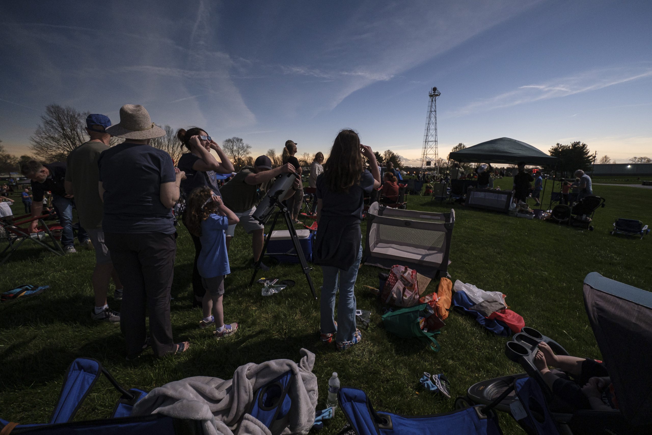 People gather for the Eclipsing the Renaissance eclipse viewing event at the Columbus Airport Airpark in Columbus, Ind., Monday, April 8, 2024.