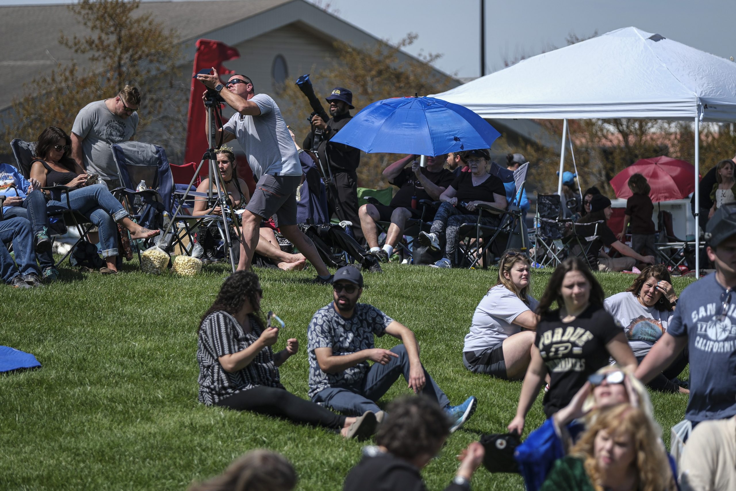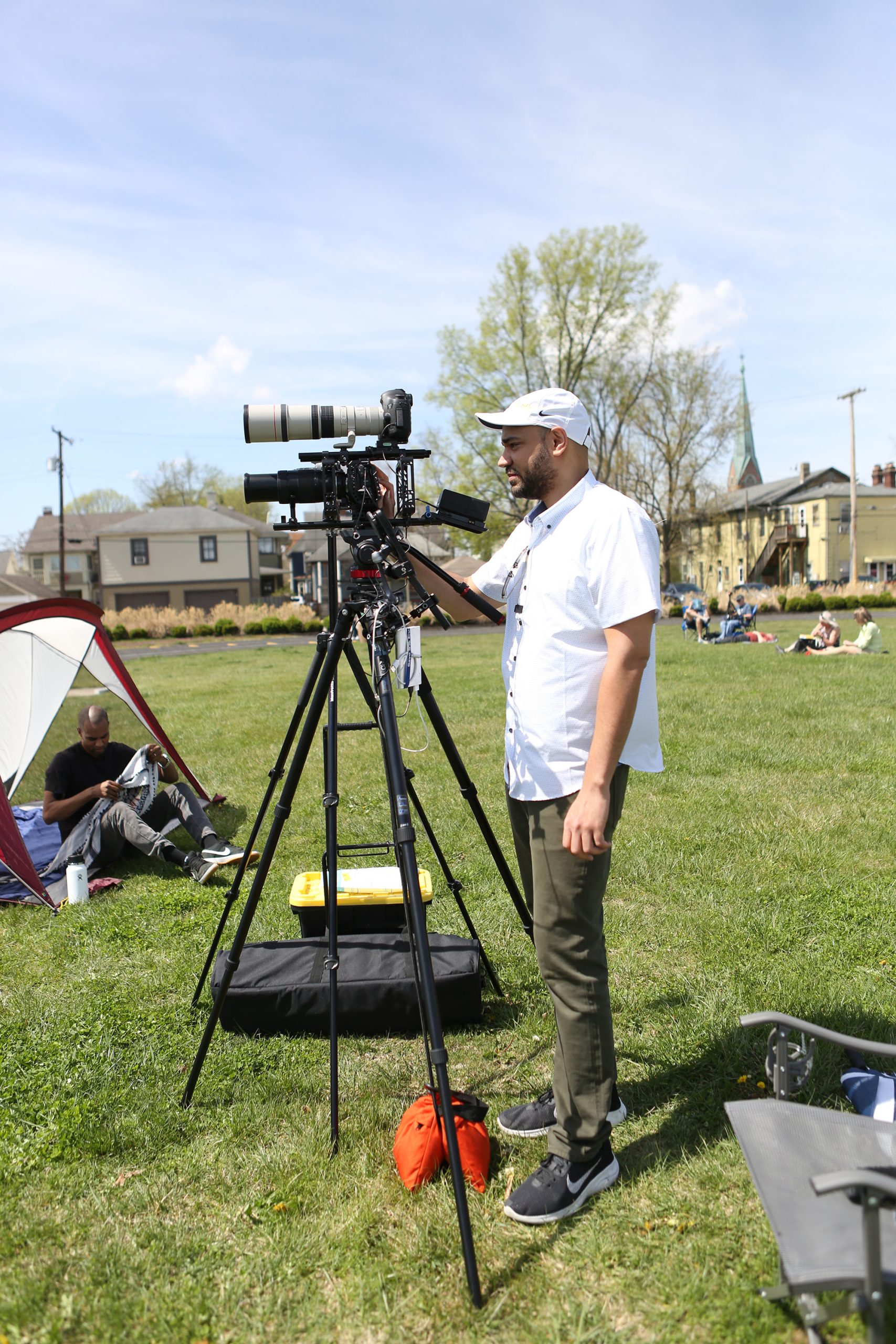 Milan Reed, from Chicago, sets up his cameras during the Solar Spectactular Eclipse Viewing Party hosted by kidscommons and the Bartholomew County Public Library at Central Middle School, Columbus, Ind., Monday April 8, 2024.