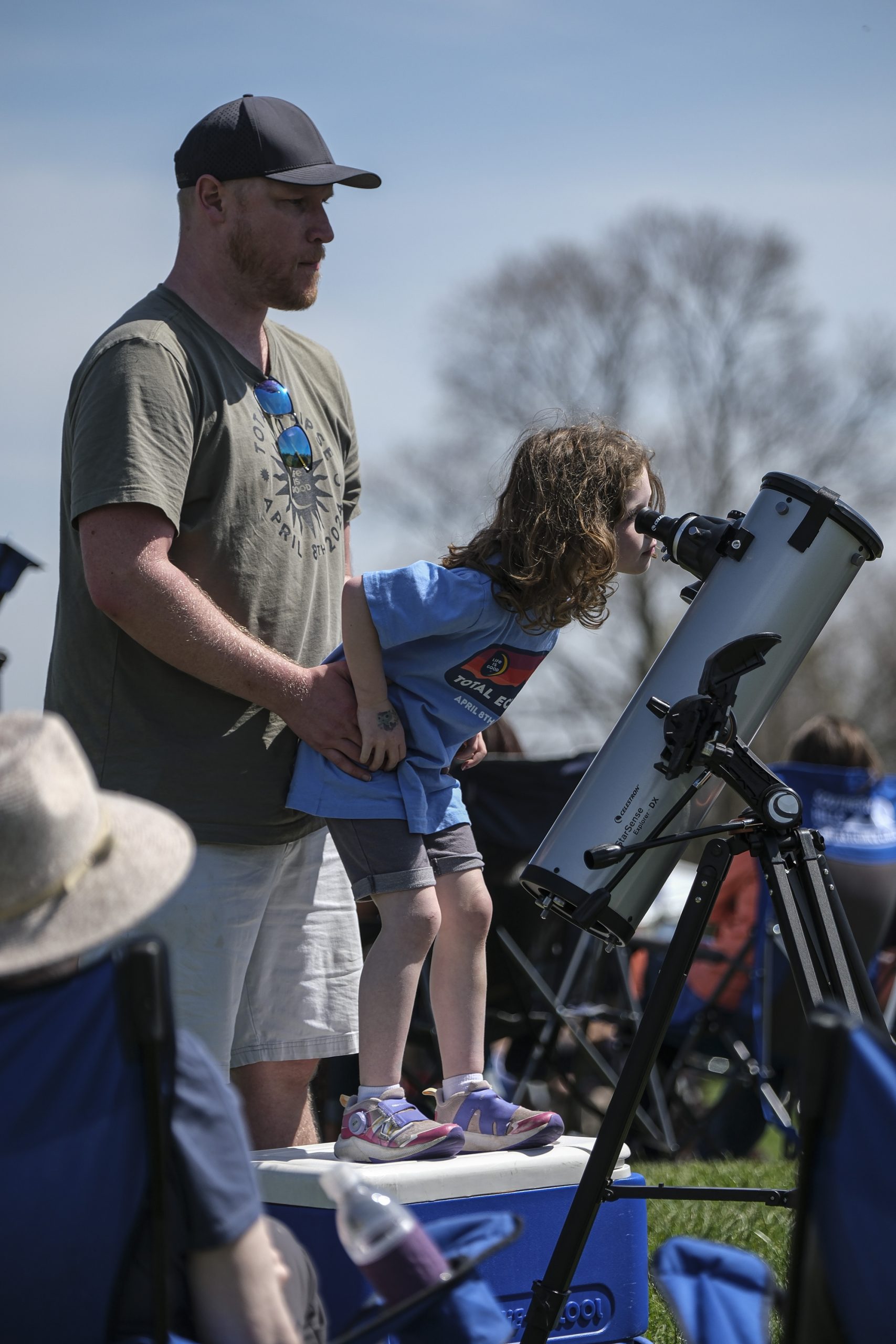 Daniel Blouin helps his daughter Clara get a look at the total solar eclipse through there telescope during the Eclipsing the Renaissance eclipse viewing event at the Columbus Airport Airpark in Columbus, Ind., Monday, April 8, 2024.