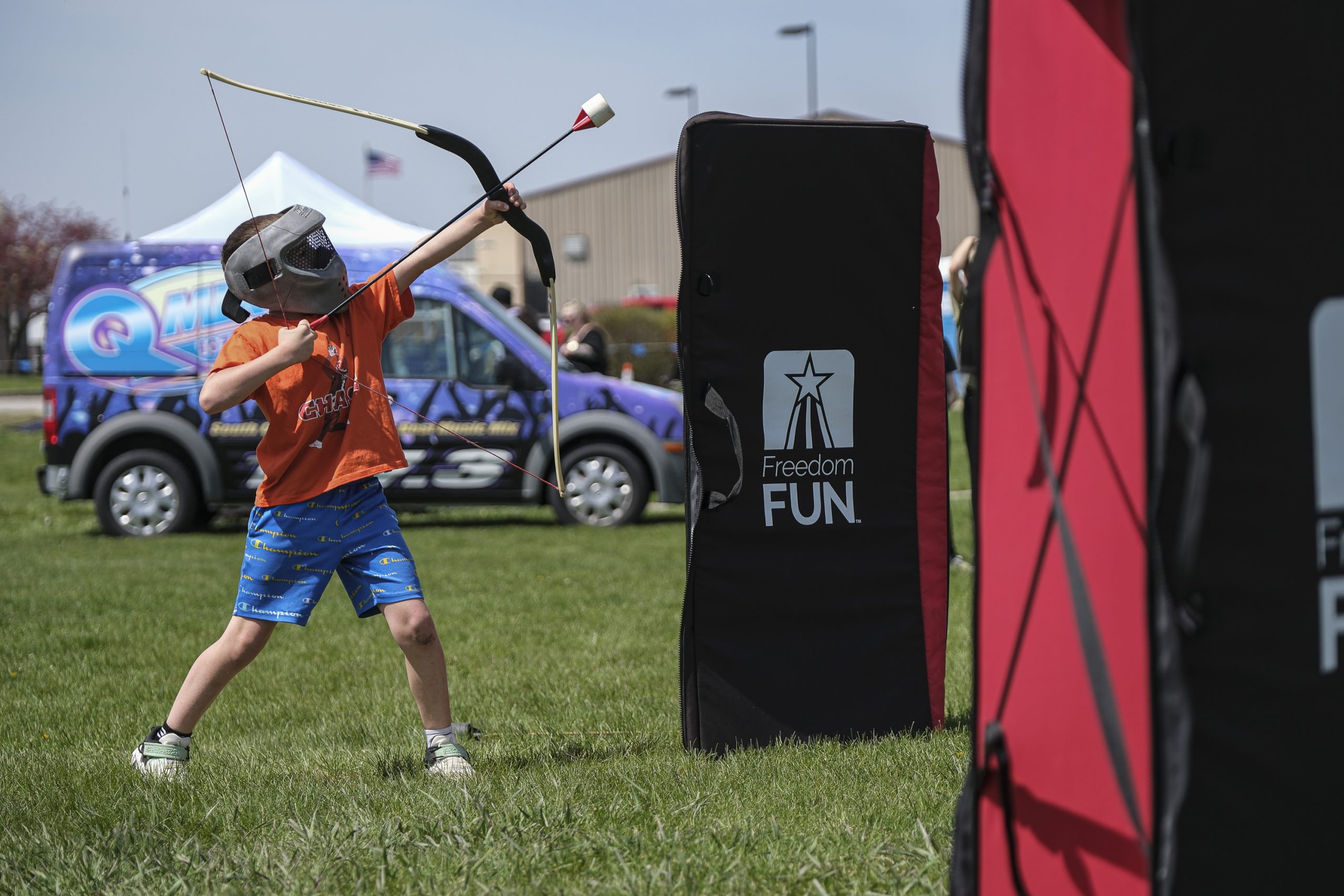 Cole Willacker plays archery tag during the Eclipsing the Renaissance eclipse viewing event at the Columbus Airport Airpark in Columbus, Ind., Monday, April 8, 2024.