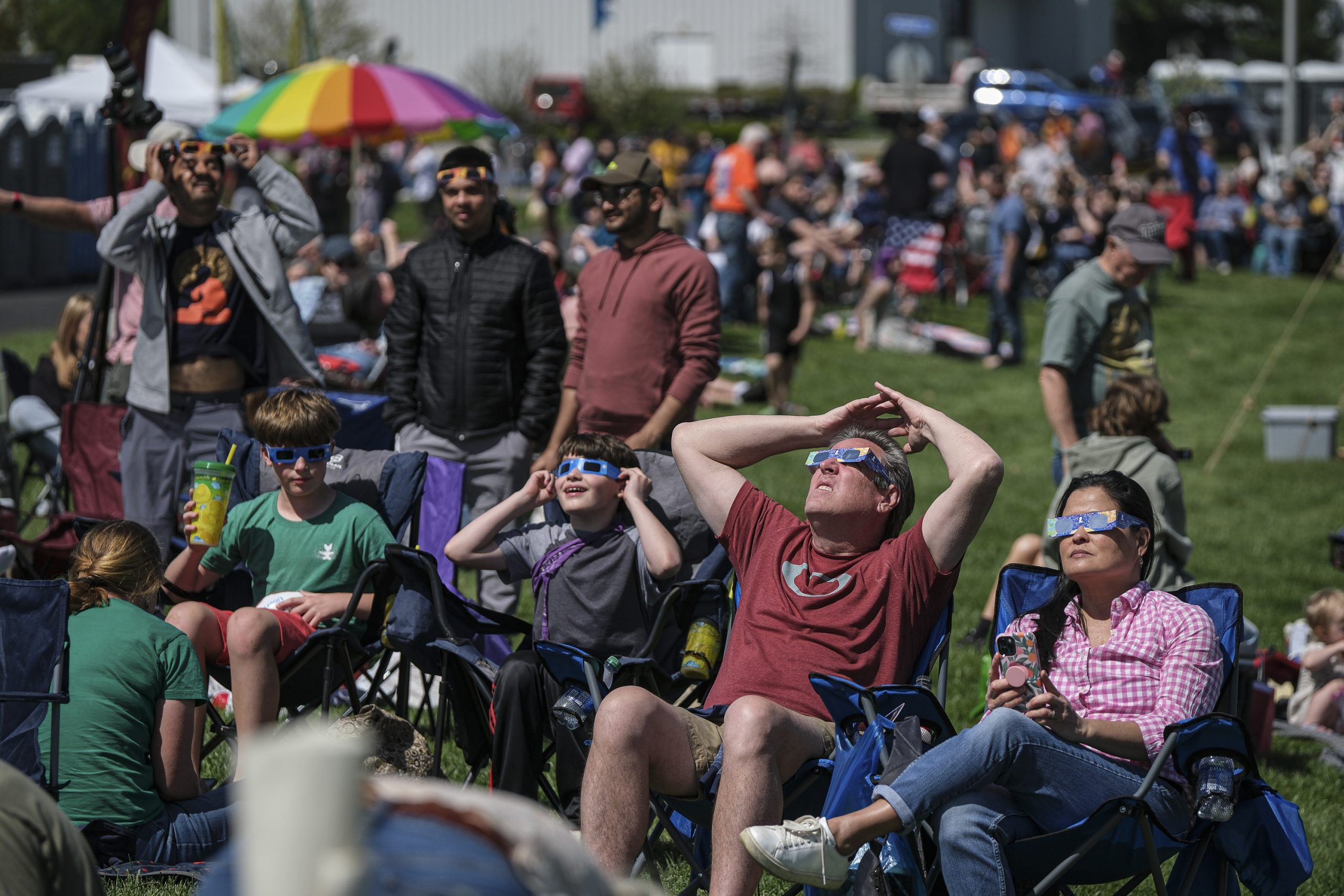Spectators put their eclipse view glasses back on as the totality of the total solar eclipse ends during the Eclipsing the Renaissance eclipse viewing event at the Columbus Airport Airpark in Columbus, Ind., Monday, April 8, 2024.
