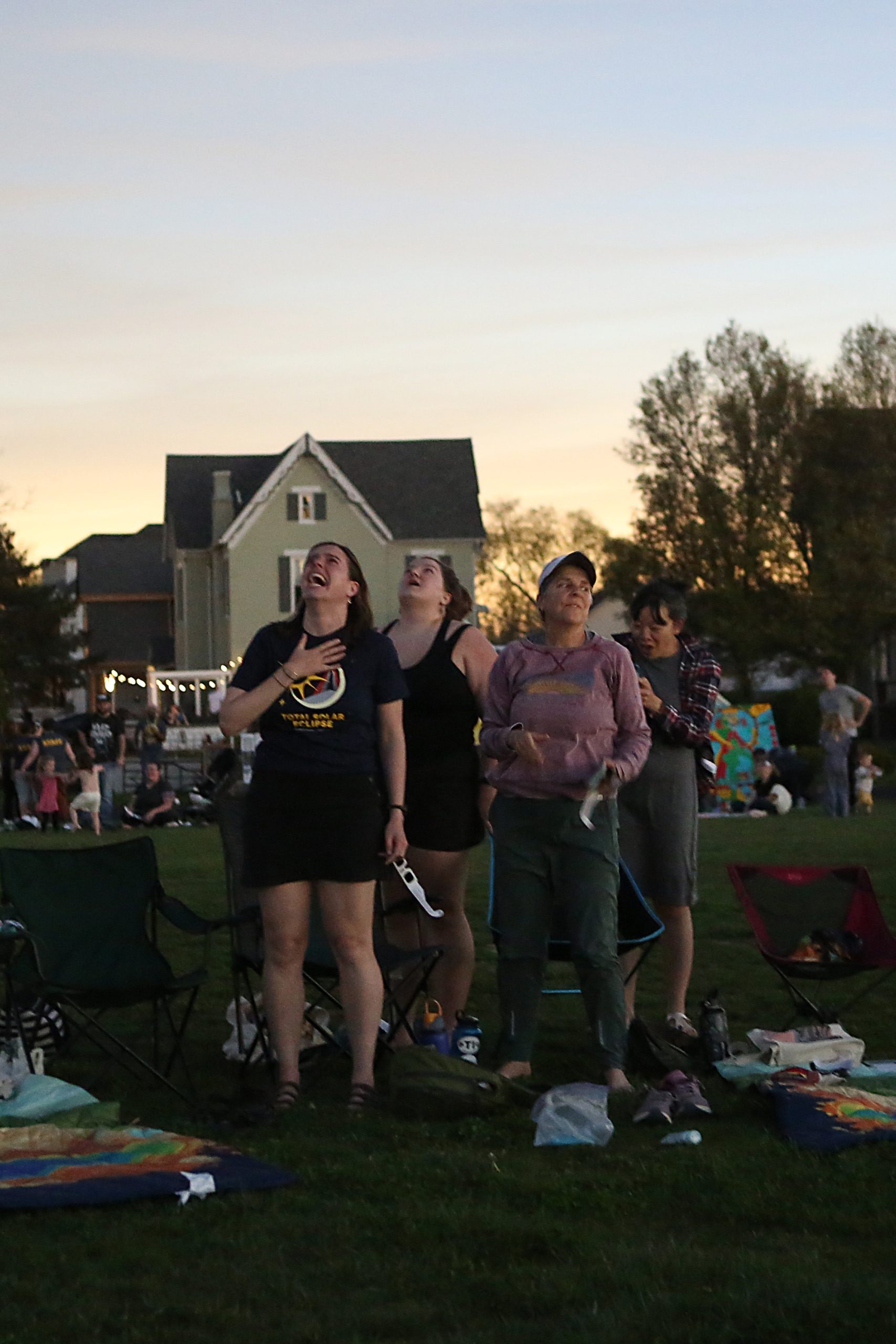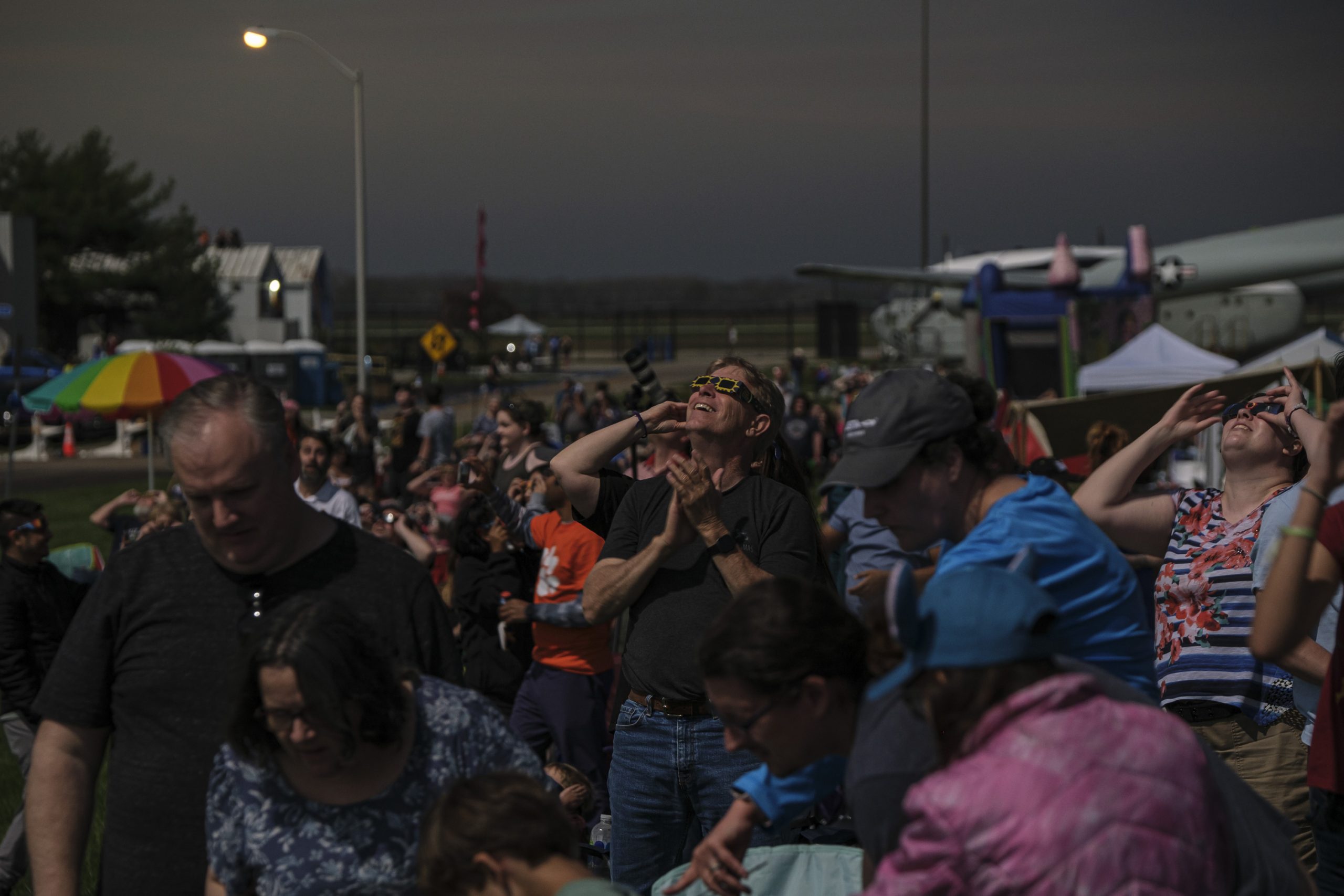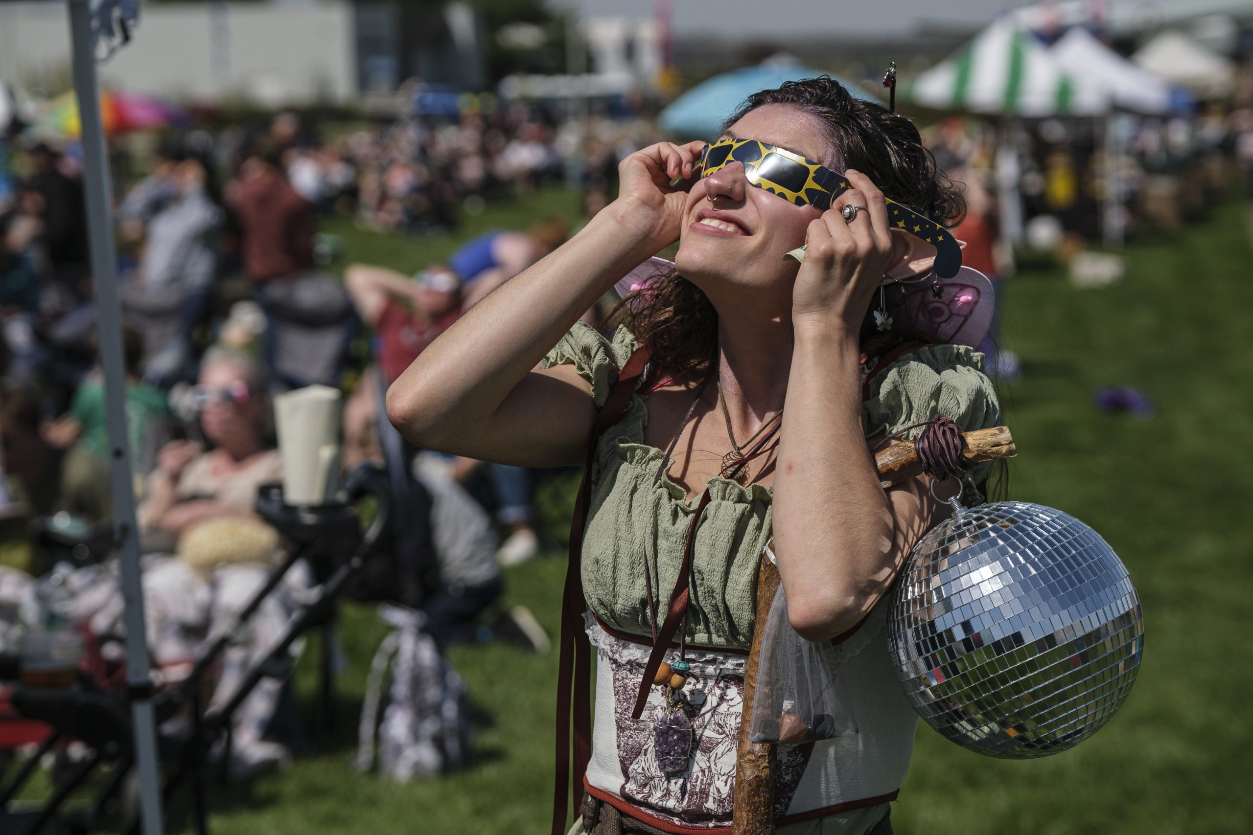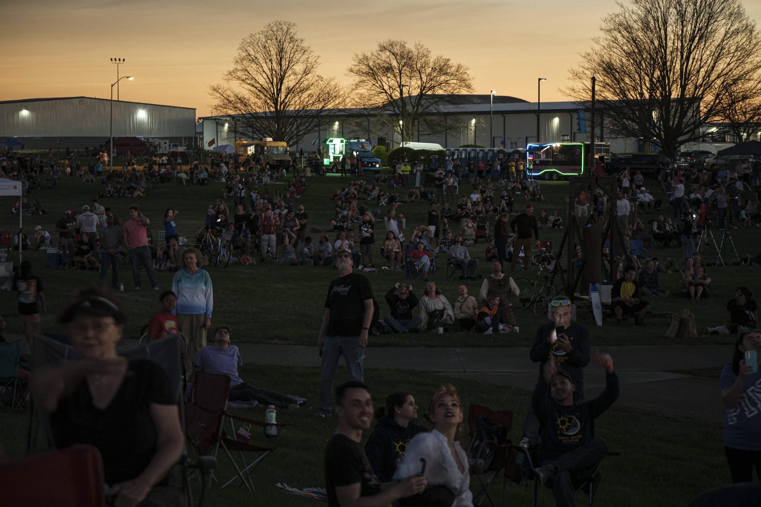 People gather at the Eclipsing the Renaissance eclipse viewing event to watch the total solar eclipse at the Columbus Airport Airpark in Columbus, Ind., Monday, April 8, 2024.
