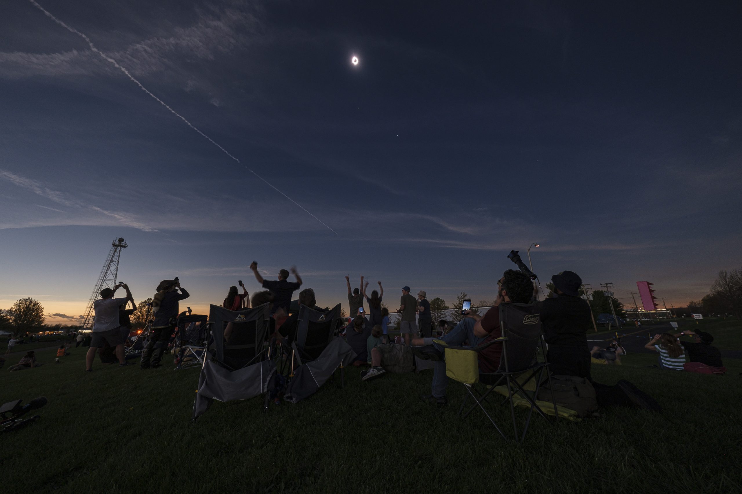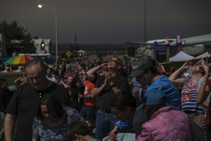 Spectators cheer as the solar eclipse reaches its totality during the Eclipsing the Renaissance eclipse viewing event at the Columbus Airport Airpark in Columbus, Ind., Monday, April 8, 2024.
