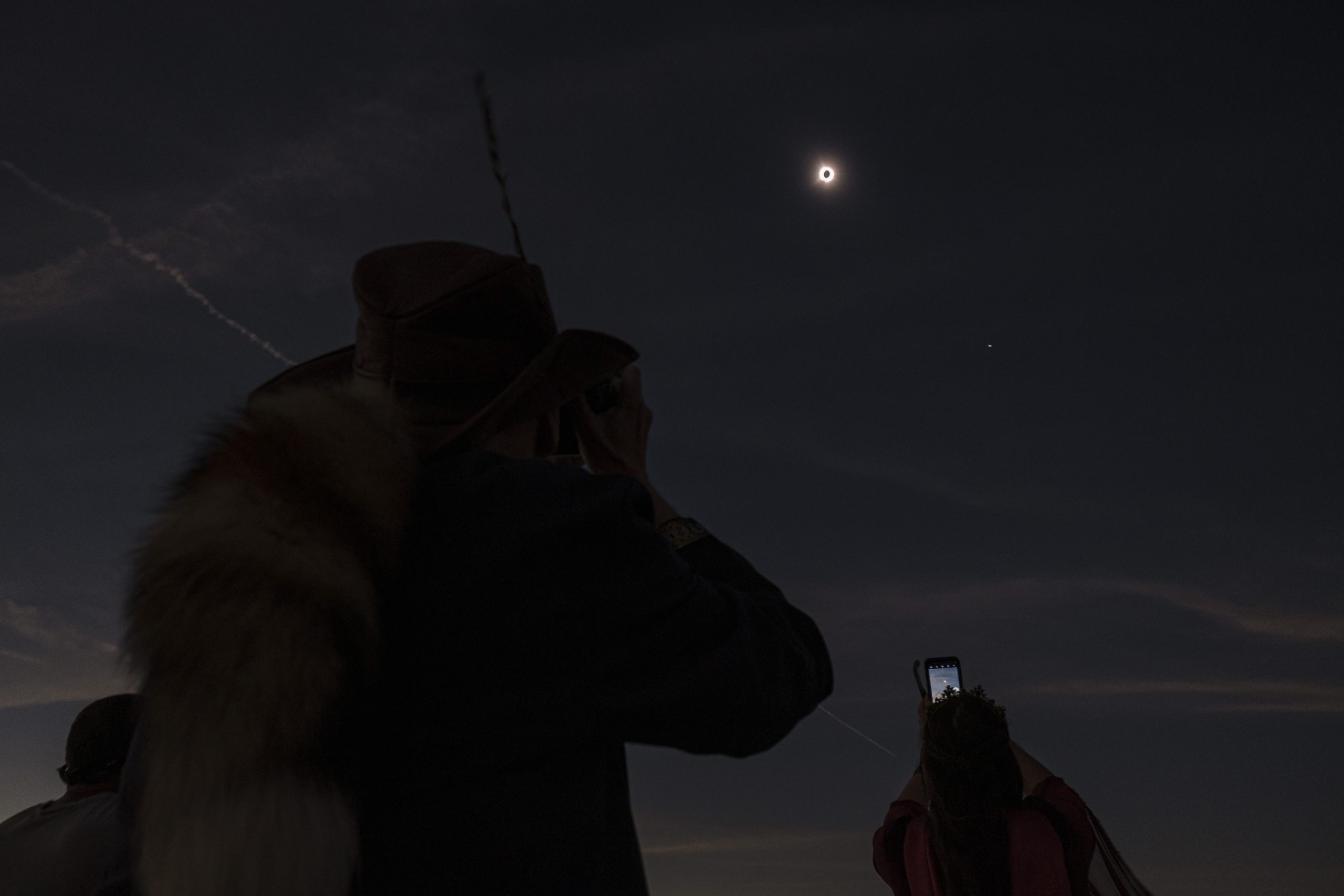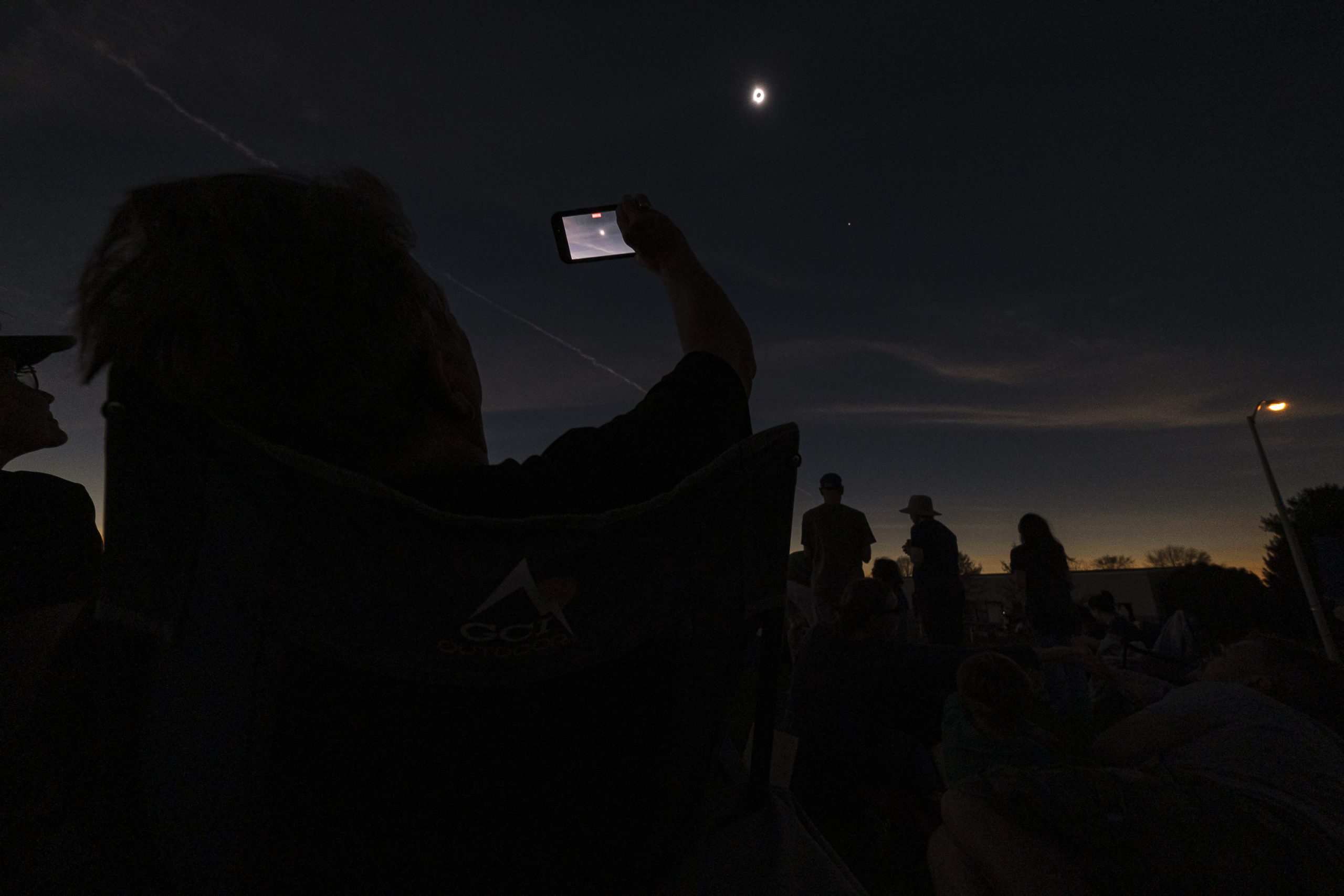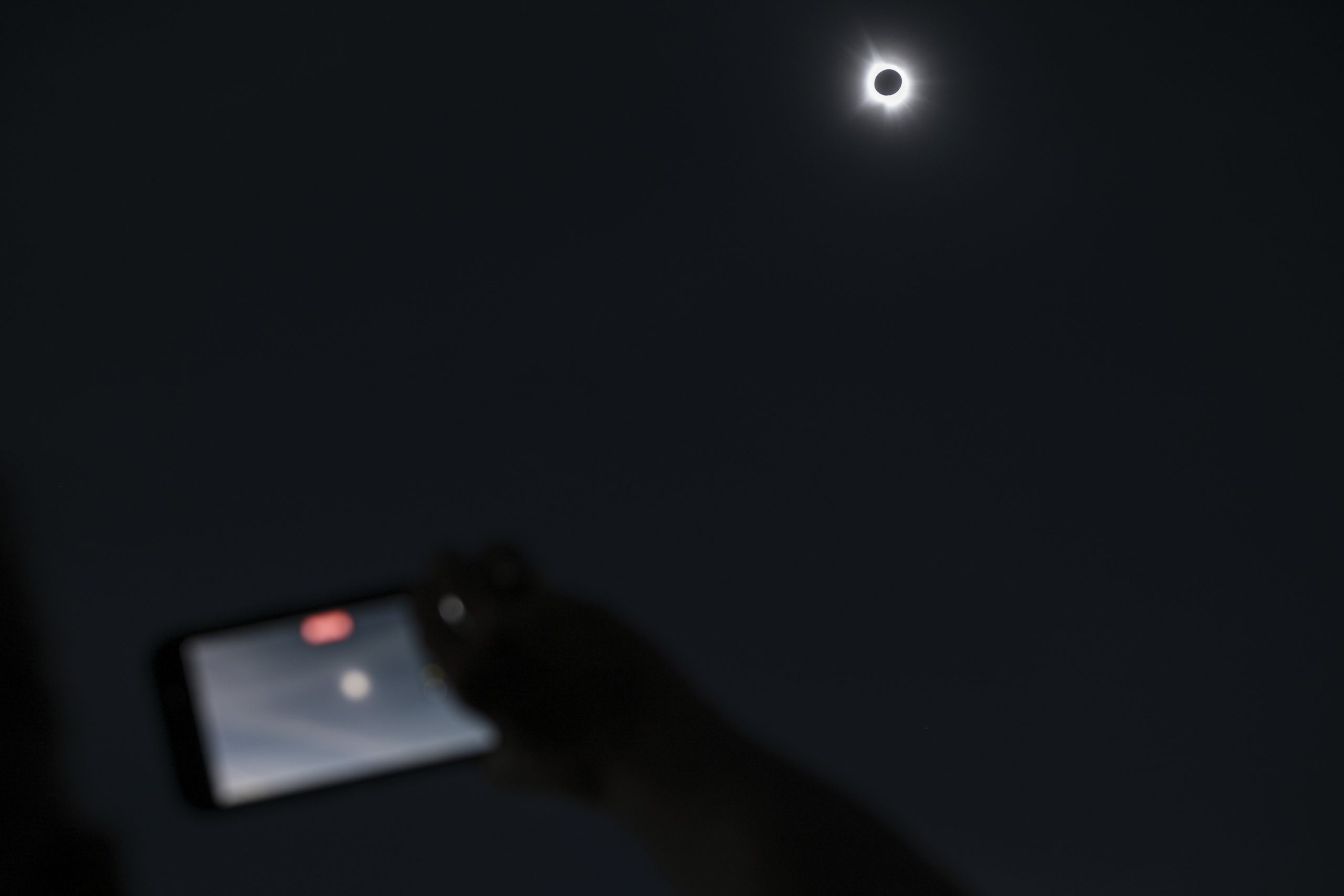 Gene Sutton shoots video of the total solar eclipse during the Eclipsing the Renaissance eclipse viewing event at the Columbus Airport Airpark in Columbus, Ind., Monday, April 8, 2024.