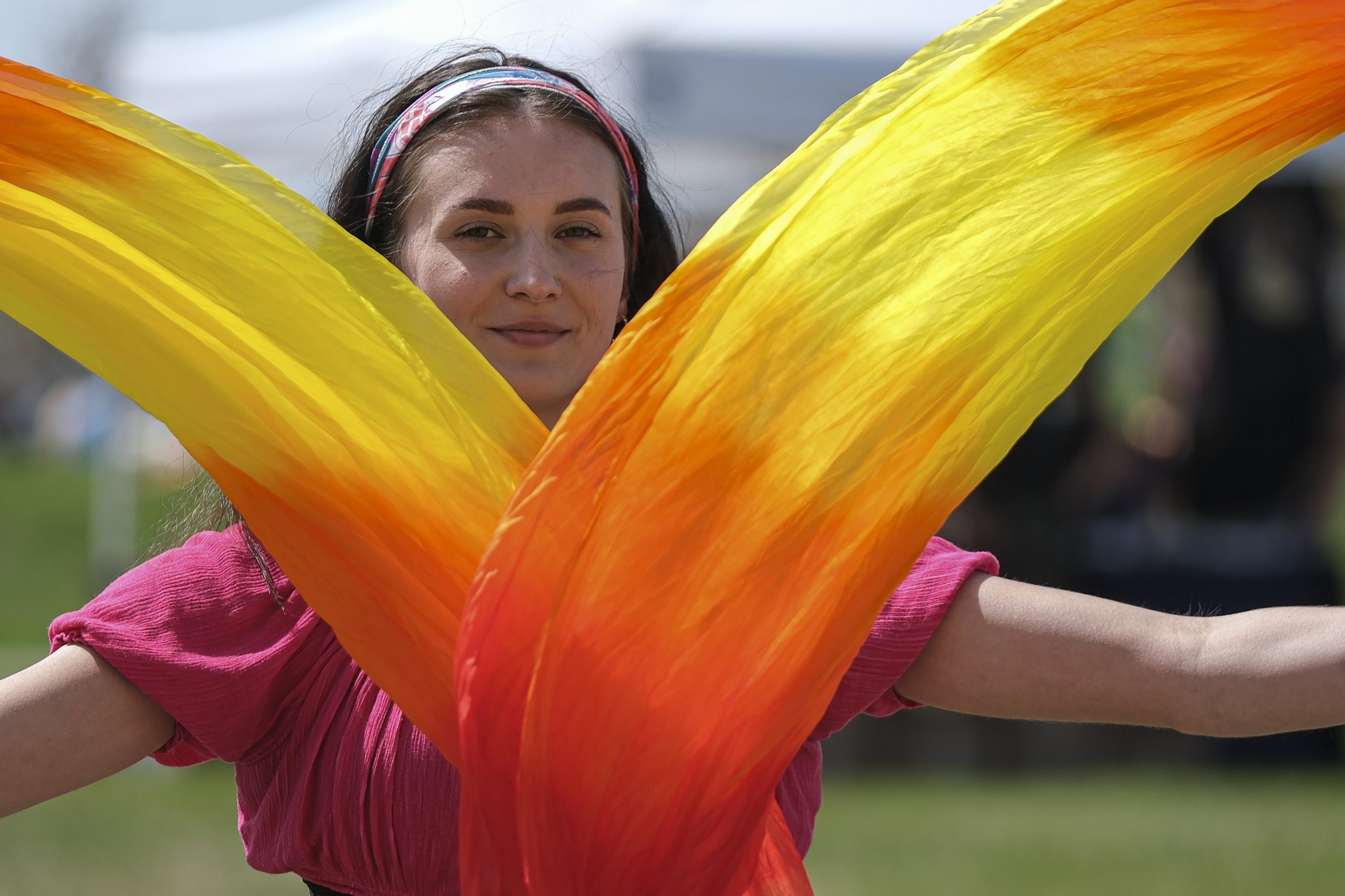 Gia Bolton, with the Cincinnati Circus, performs during the Eclipsing the Renaissance eclipse viewing event at the Columbus Airport Airpark in Columbus, Ind., Monday, April 8, 2024.