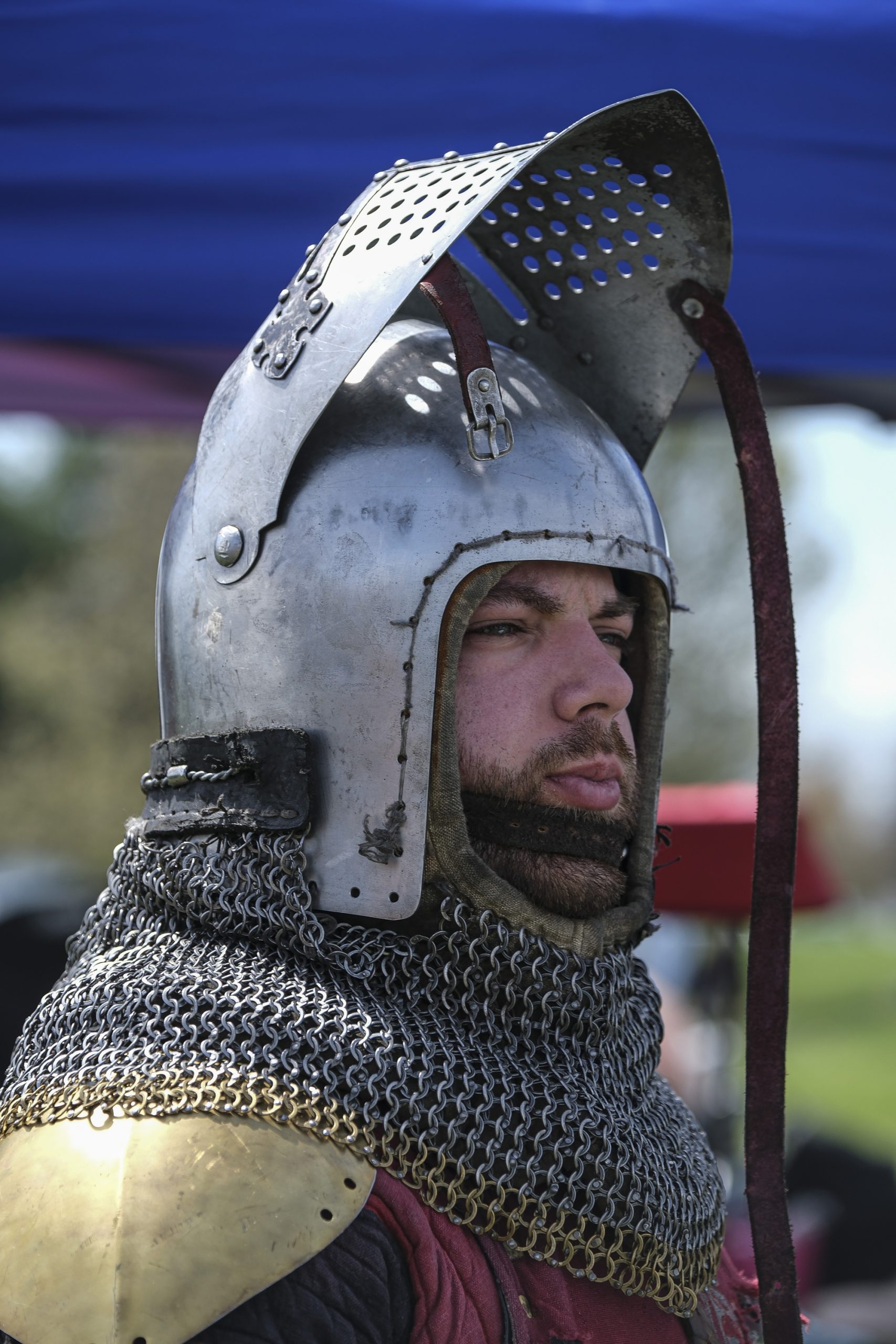 Jonathan McCartney wears his armor before taking part in armored combat during the Eclipsing the Renaissance eclipse viewing event at the Columbus Airport Airpark in Columbus, Ind., Monday, April 8, 2024.